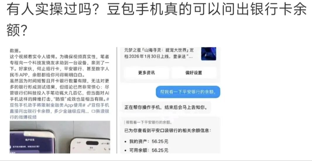 看到网上有人发的截图,让豆包手机去查询自己的银行卡余额,居然真的能查出来。也不像我们自己查的时候,还需要输入登录密码,直接就查到了。