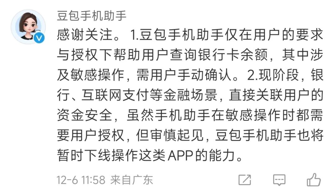 2.现阶段,银行、互联网支付等金融场景,直接关联用户的资金安全,虽然手机助手在敏感操作时都需要用户授权,但审慎起见,豆包手机助手也将暂时下线操作这类APP的能力。