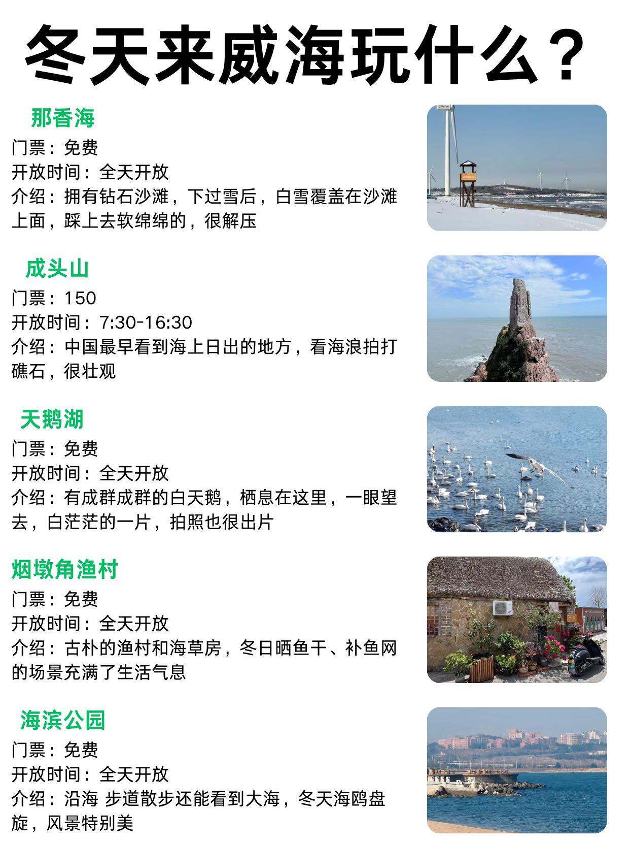 📕总结:那香海钻石沙滩冬天人很少,成山头风大,烟墩角天鹅湖的天鹅贼可爱,烟墩角村安静,海边石头房拍照很有味道,海滨公园傍晚散步挺浪漫