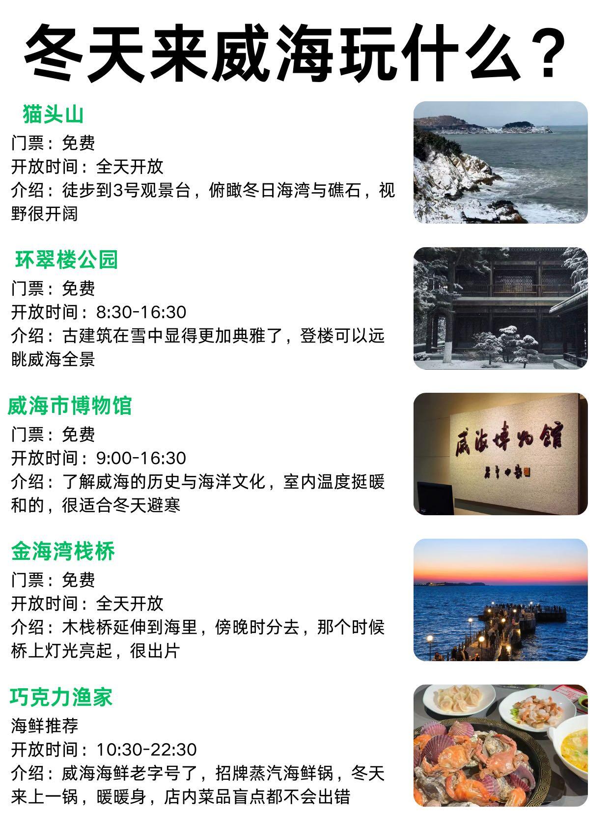 📕总结:猫头山观景台风大,景色美,环翠楼公园逛了圈,冬天树秃秃的,散散步还行,威海市博物馆室内暖和,还能涨知识,金海湾栈桥傍晚🌆很出片