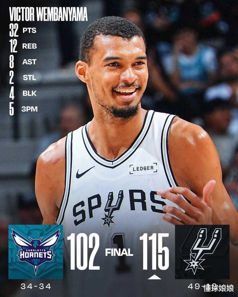 今天马刺115-102击败了黄蜂