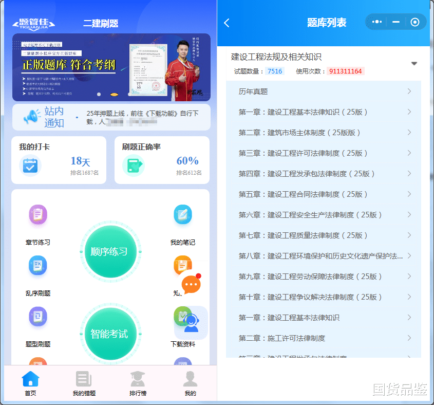 题库的话要慎重,市面上的太多了,且鱼龙混杂稍不留意就会踩坑。目前反响比较不错的事题管佳的《二建刷题》小程序,更新速度、章节题量、真题完整性、原题率都很不错,适合备考使用。