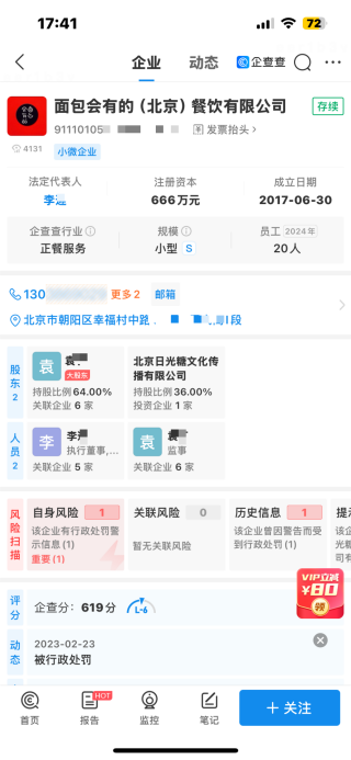企某查信息显示,“面包会有的”品牌所属主体为“面包会有的(北京)餐饮有限公司”,成立于2017年6月30日,注册资本666万元,法人为李某。而该公司大股东正是袁丁(袁丁系原名,现为袁弘),持股比例高达64%,张歆艺与袁弘夫妇不仅是品牌创始人,还亲自为其代言推广。