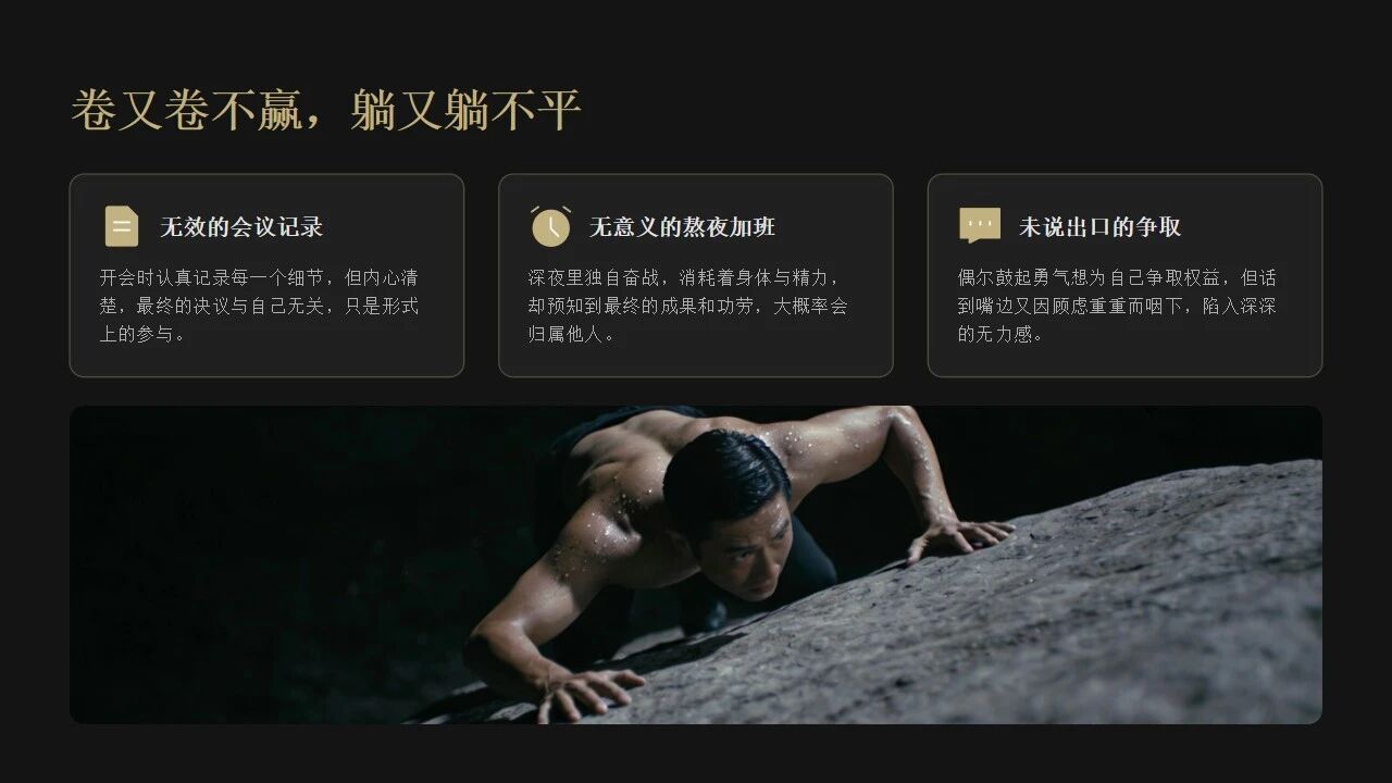 开会时,你还在认真记笔记,但知道那些决议跟你没关系加班时,你还在熬,但知道熬出来的果子,是别人的偶尔想争取点什么,话到嘴边又咽回去:“算了,就这样吧”