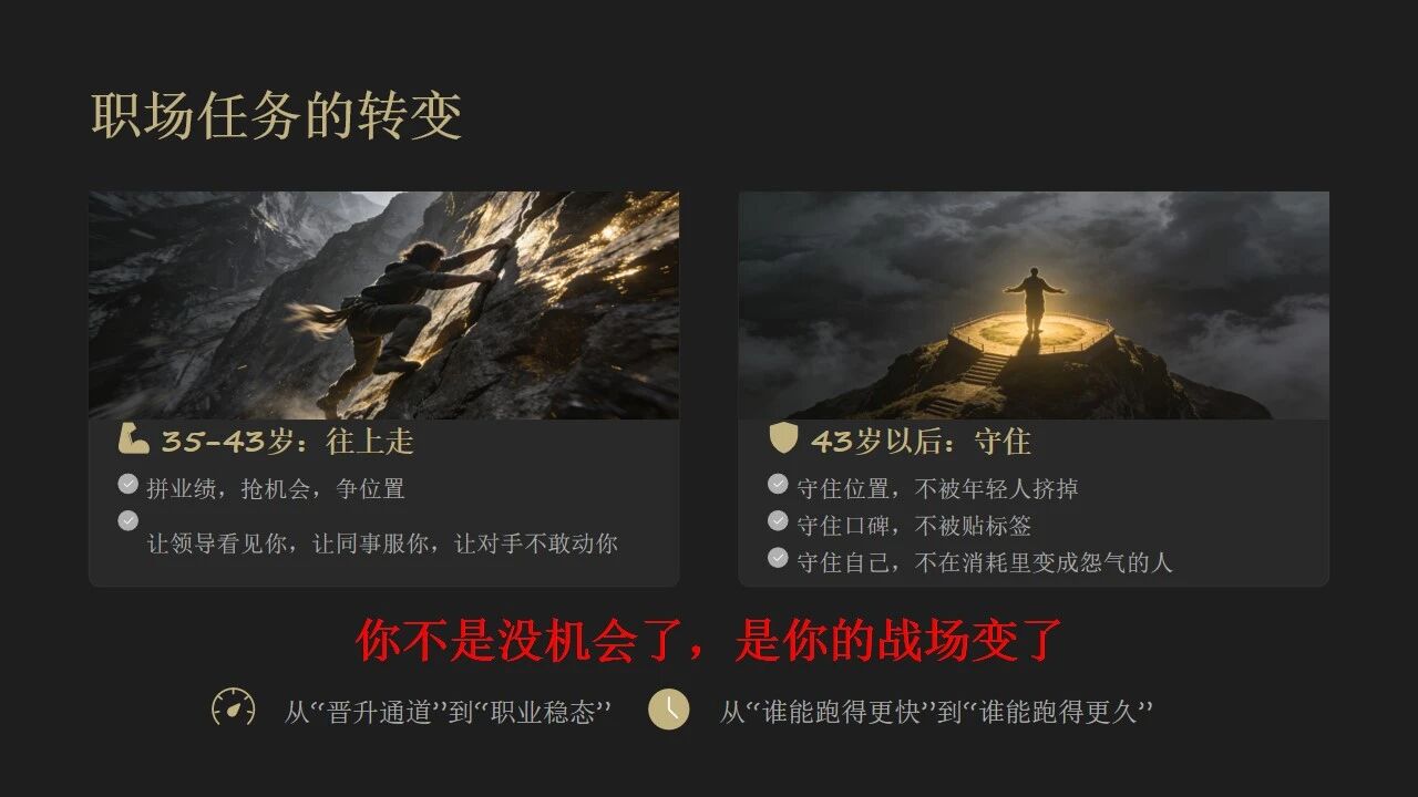 有一个真相,很少有人告诉你:43岁之后,职场给你的任务变了。35岁到43岁,你的任务是“往上走”: