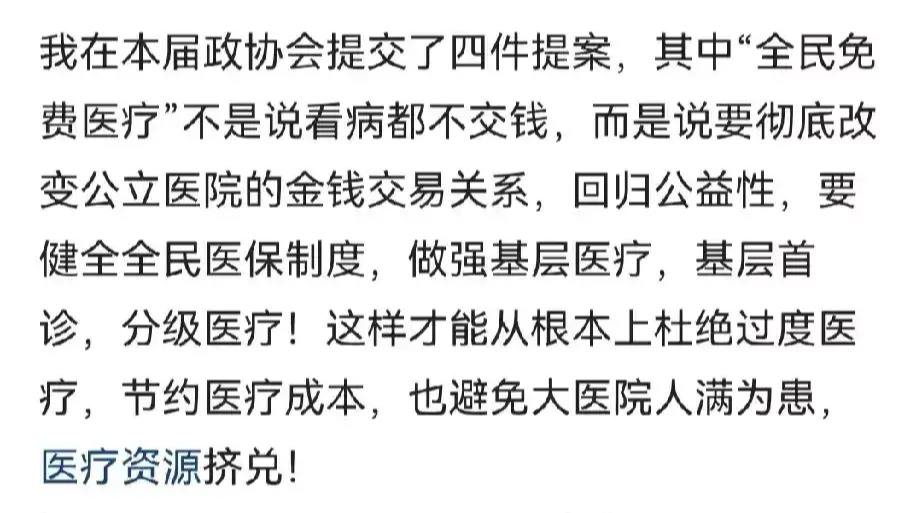 不得不说,这个提案真是浪费时间。我们国家刚刚完成全面脱贫,怎么可能一下子就全民免费医疗呢?就连许多发达国家都没有实现。想想一伙子人生了病住在医院,有人伺候,还管吃管喝,谁还愿意干活呢?再说了,这可是个无底洞,以我们现阶段财力,根本无法承担。这个代表不如提一下如何杜绝医院乱收费、医生收红包等现象发生。