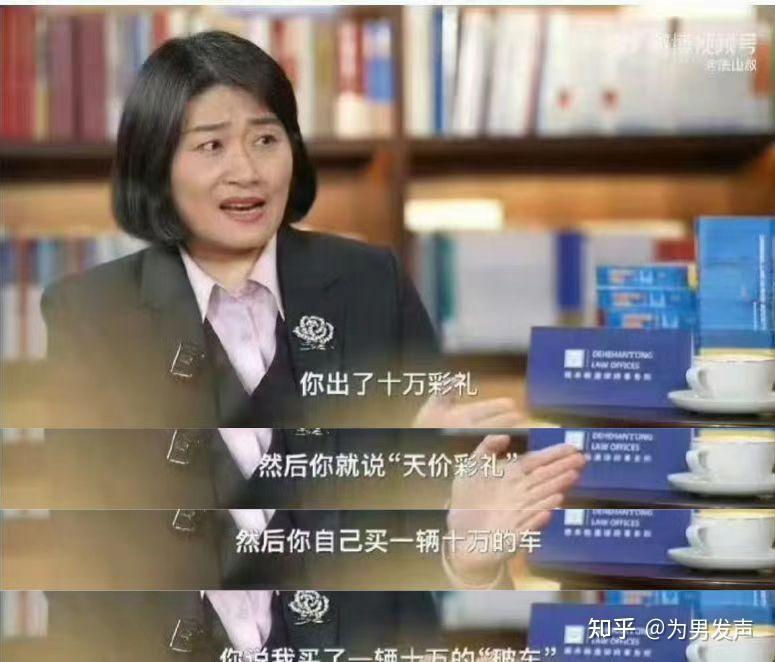 •关于“车与人”的神比喻:为了论证彩礼不贵,她抛出了一个惊世骇俗的比喻:“你出了十万彩礼,你说是天价;你自己买一辆十万块的车,你说自己买了一辆‘破车’。”