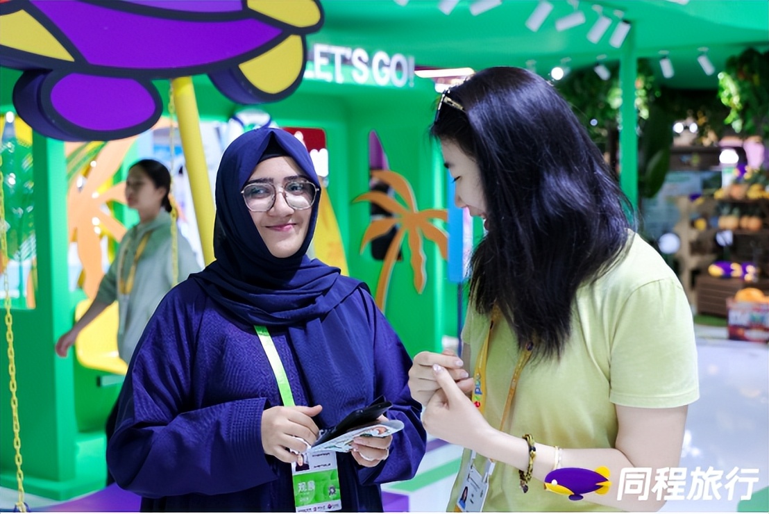 (图为第六届消博会同程旅行展区,工作人员与国际同行交流)