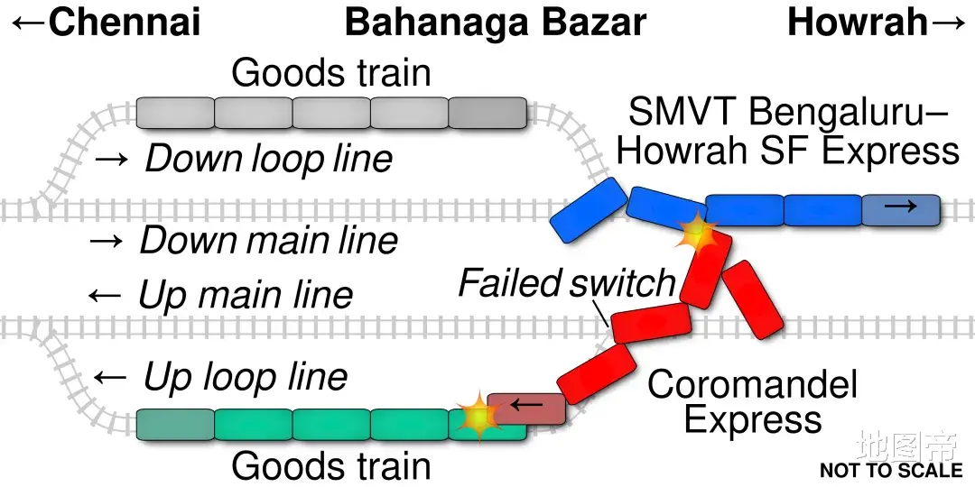 失事三列火车都是印度国产,客运列车从加尔各答开往马德拉斯,在奥迪沙邦巴拉索尔市巴哈纳贾火车站附近脱轨,导致车厢翻倒,部分车厢落在对向轨道上。随后一列班加罗尔开往加尔各答的客运列车从对向轨道驶来,撞上先前脱轨的车厢,造成几节车厢也脱轨,而先前脱轨的车厢又撞上一列货运列车的车厢。