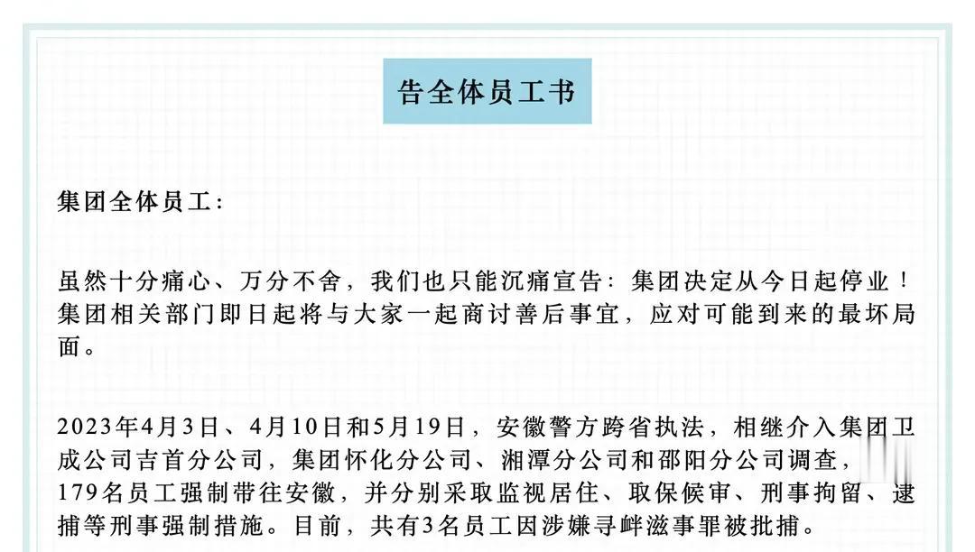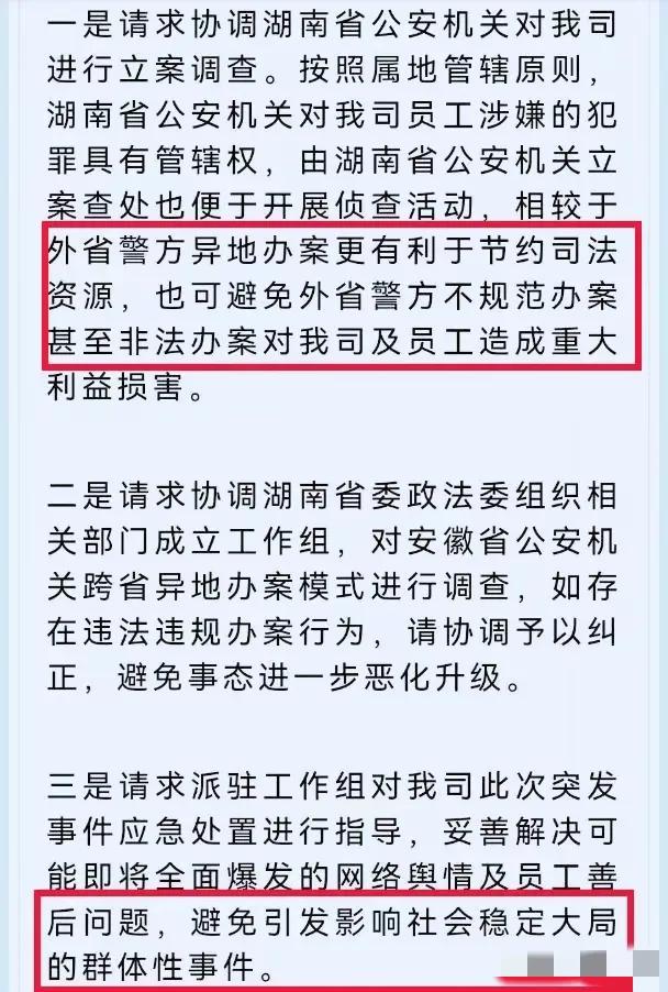 永雄集团居然要求案件转回湖南办理。看来永雄公司还是改不了毛病,一个《告全体员工书》充满威胁口吻。 根据我国规定,外地警方要去所在地办案,必须跟所在地警方报备。安徽警方之所以敢搞出这么大的动静,查处永雄公司,跨省抓捕永雄员工,可能没跟湖南方面通气吗? 永雄公司想通过舆论施压,要求将案件转回湖南办理,本质上是想发挥自己地头蛇的势力。只可惜,永雄所做所谓天怒人怨,相信湖南方面也会秉公执法。 永雄公司还公然要求对安徽省的办案进行调查,声称调查是“避免事态进一步恶化”,潜台词就是如果调查,“事态就会进一步恶化”,这算威胁吗? 这还没完,还拿“网络舆情”和“员工善后问题”甚至“影响社会稳定的群体性事件”来说事,充满了威胁口吻。 看来永雄公司平时威胁惯了,一个《告全体员工书》就充满了威胁的口吻。看永雄公司的意思,如果这事不能得到满意的解决,就是网上舆论和群体性事件。 只可惜,永雄公司名声臭了,想为永雄洗地?网民答应吗?员工群体性事件?干催收的有几个是干净的?