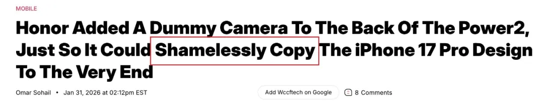 Wccftech 等海外数码媒体很快跟进,火力甚至更猛,直接把说法从“接近”升级为“抄袭”,称荣耀 Power2 “无论外观还是系统,都在复制 iPhone 17 Pro”。