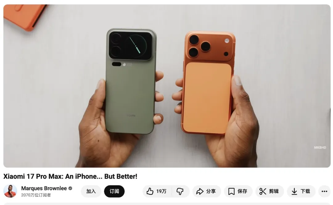 MKBHD 评价小米 17 Pro Max:这是一个用来 one-up iPhone 的产品。意思是外观与理念上接近苹果,但在规格和实用性上做得更激进;