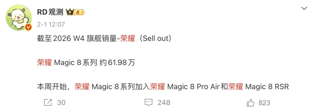 以 Magic 8 为例,截至2026 年第四周,包含了 Magic 8 Pro Air 之后,全系列销量仍然只有约 61.98 万,被同期小米 17 系列的 318 万、华为 Mate80 系列的254 万远远甩在后面。