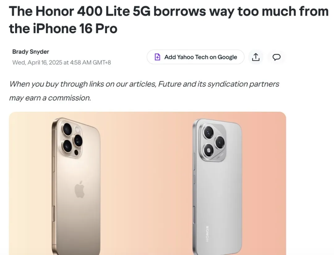 雅虎科技甚至在标题中直言不讳,称荣耀 400 Lite 5G“借鉴了过多 iPhone 16 Pro 的设计元素”。