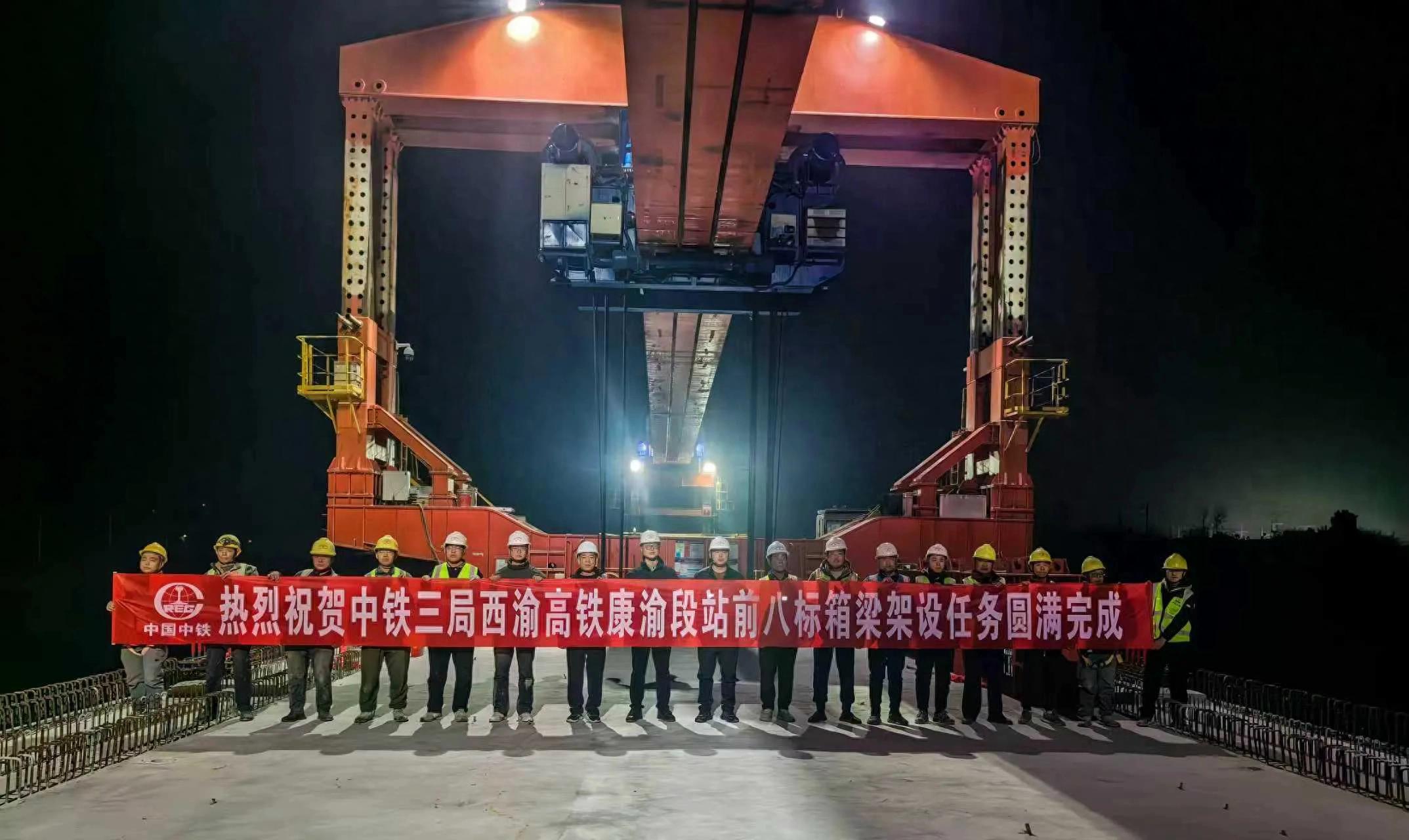 12月17日晚19时36分,随着最后一榀900吨重的箱梁精准落位,西渝高铁康渝段八标顺利完成767孔箱梁架设任务,成为全线首家完成箱梁架设任务的标段,为后续桥面系和铺轨施工奠定了坚实基础。