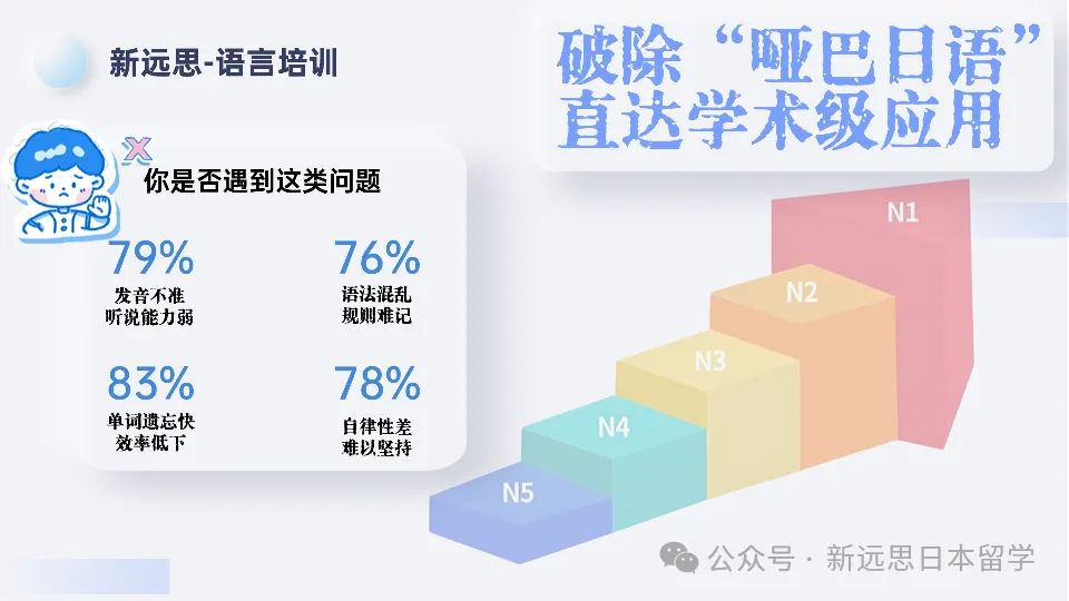 从语言能力提升到院校录取,再到留学生活适应,新远思以三大主营业务的协同优势,为学员提供“一站式”日本留学解决方案。未来,我们将继续秉持专业初心,优化服务细节,助力更多学子在日本顶尖院校的平台上实现人生理想。