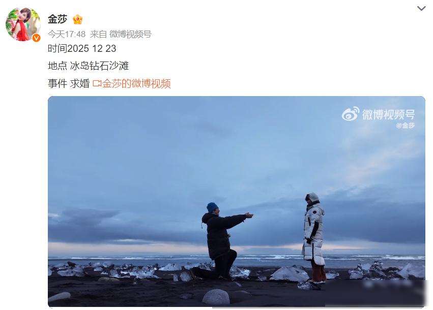 2025年12月23号,冰岛那边下了点雪,金莎和孙承潇在那里求婚,他没搞什么煽情拥抱,她听了两下,点点头接过戒指,他手抖得厉害,连花都没带,誓词也短得像报菜名,她反而笑起来,说你比我还要紧张,他第一反应不是亲她,是赶紧帮她裹紧羽绒服,这画面跟那些偶像剧里王子跪地、公主冲过去的桥段完全不一样。