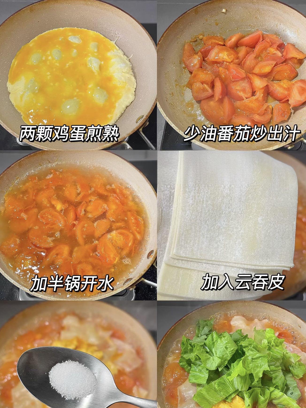 小贴士:番茄一定要炒出汁,汤色才亮;云吞皮最后放,煮久易烂;蛋液要缓缓倒入,才能成“金色云朵”。