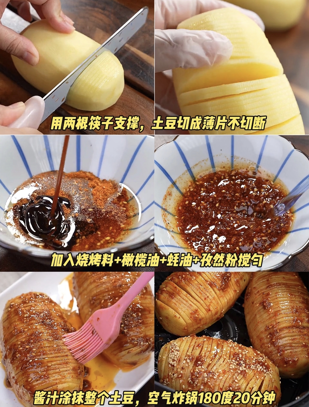 先说说这道菜的“来头”吧——其实它算是“懒人版烤土豆”的进阶款,最早是西餐厅里的花活菜,后来被网友改成了家常版:不用复杂工具,靠两根筷子就能切出“风琴褶”,再裹上万能酱汁一烤,直接把普通土豆变成能上桌撑场面的硬菜。我第一次做是周末犯懒不想炒菜,翻到教程随手试了试,结果刚出锅我弟就抱着盘子啃了俩,连平时嫌土豆没味儿的老妈都追着要配方,现在它已经是我家每周必做的“家庭快乐菜”了。