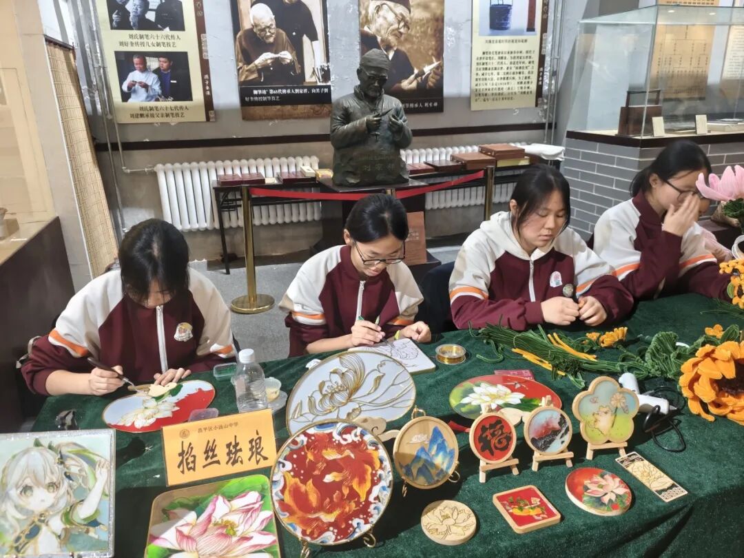 领导和嘉宾观看书画展,以及掐丝珐琅、草编、纸浆画、壁画、国画、衍纸等特色社团展示。