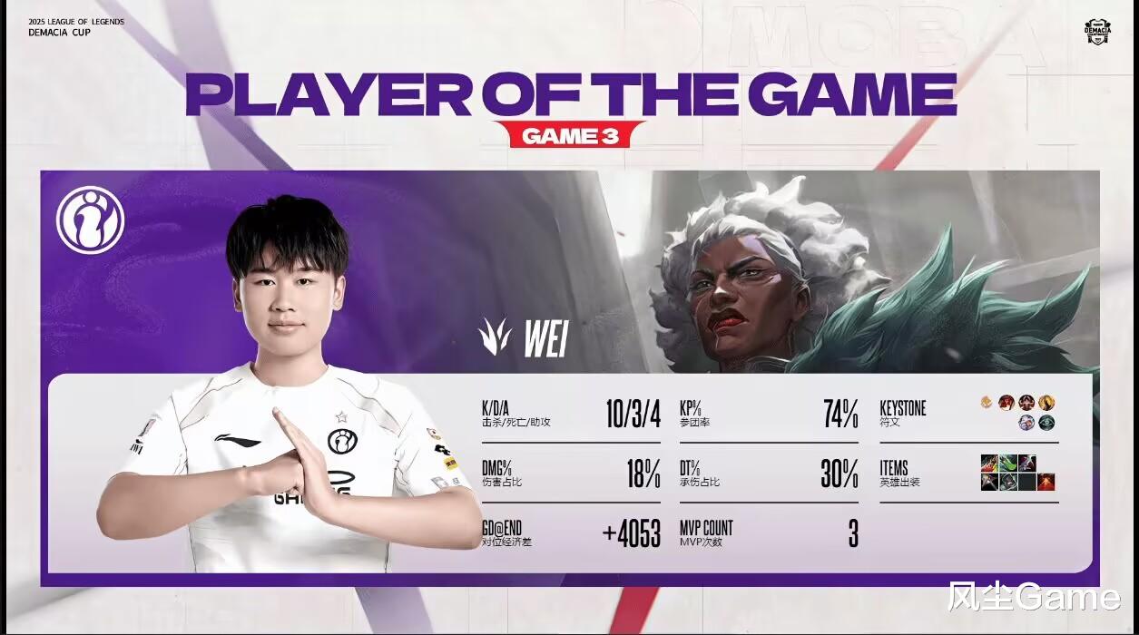 第四把滔搏前期优势挺大的,6分钟女警2-0开局,结果团战又被IG暴打了,滔搏人头领先,经济反而落后,到了团战期,滔搏又被各种操作,仅仅27分钟,滔搏主水晶就炸了,整场看下来,IG上野辅三个位置,是对位碾压了,Wei的狼母、潘森都有亮眼表现,赢的三局,他拿了2个MVP。