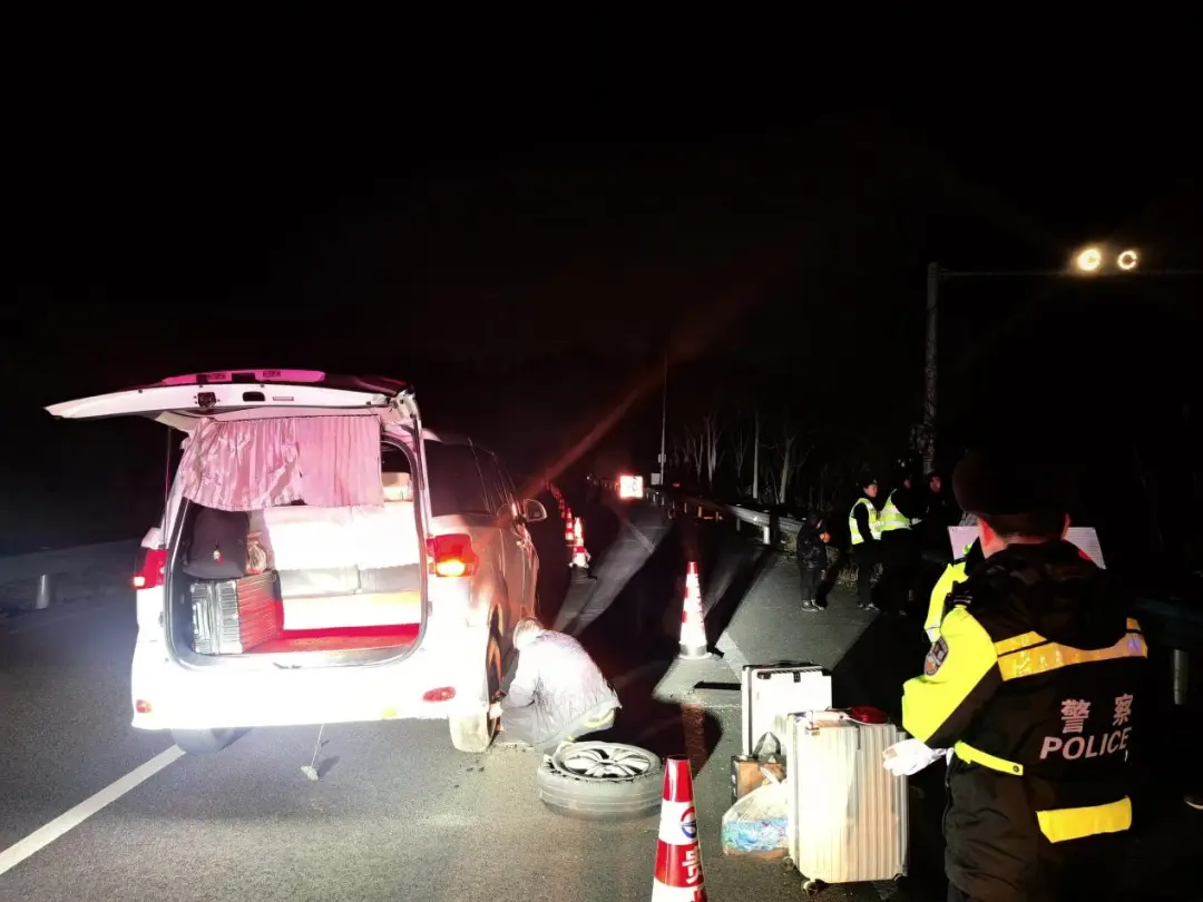 当晚20时许,联合执法组在S27武道高速K42处巡查时,发现一辆小型客车停于应急车道,驾驶员称行驶中右后轮突发爆胎,导致车辆无法行驶。