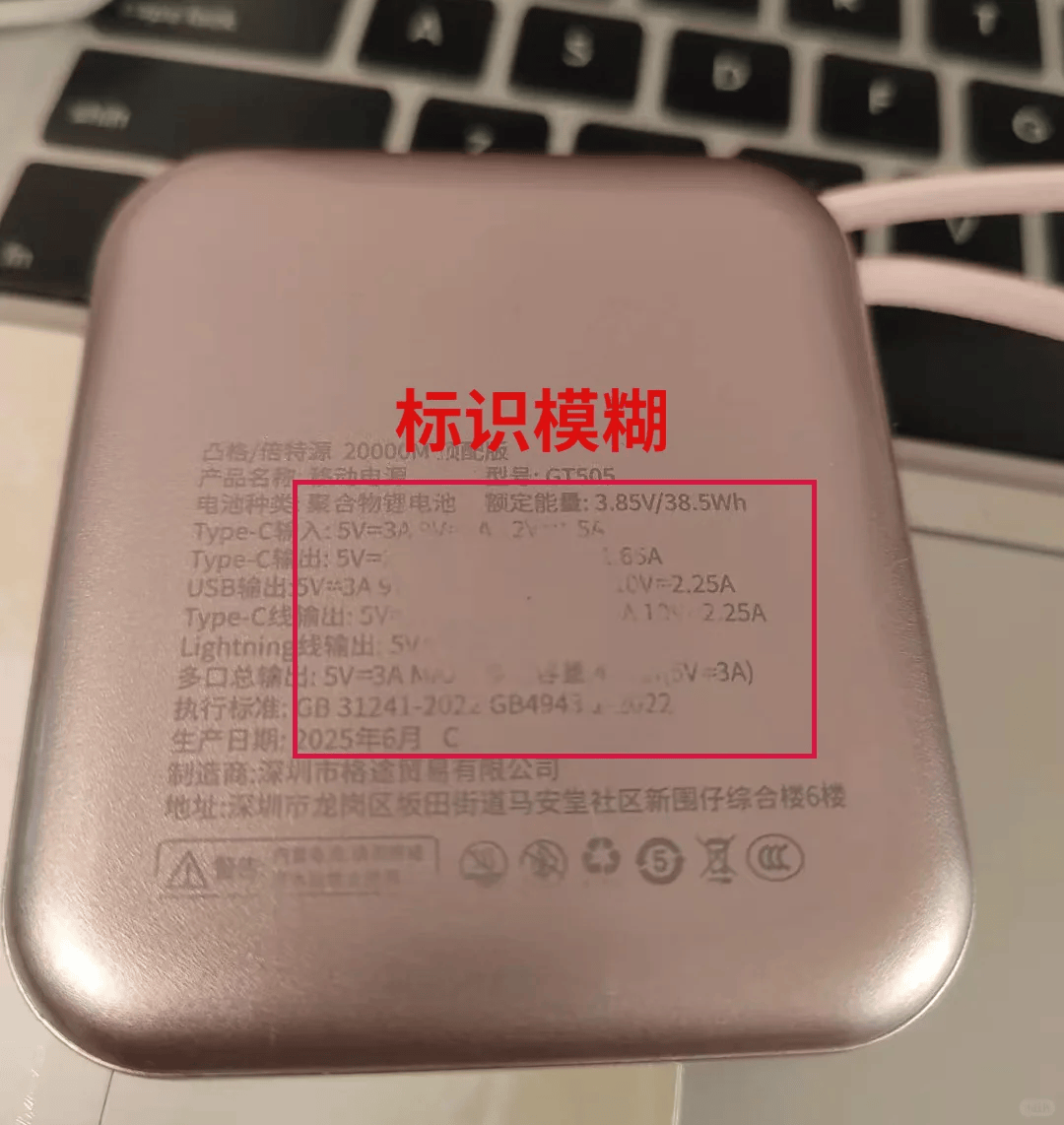 一款合格的充电宝是必须要注明产品名称、电池容量、额定输出/输入功率、制造商信息以及安全认证标识的,如果机身上没有这些标注或者参数模糊不清的话,建议谨慎购买,避免买到劣质产品影响安全。