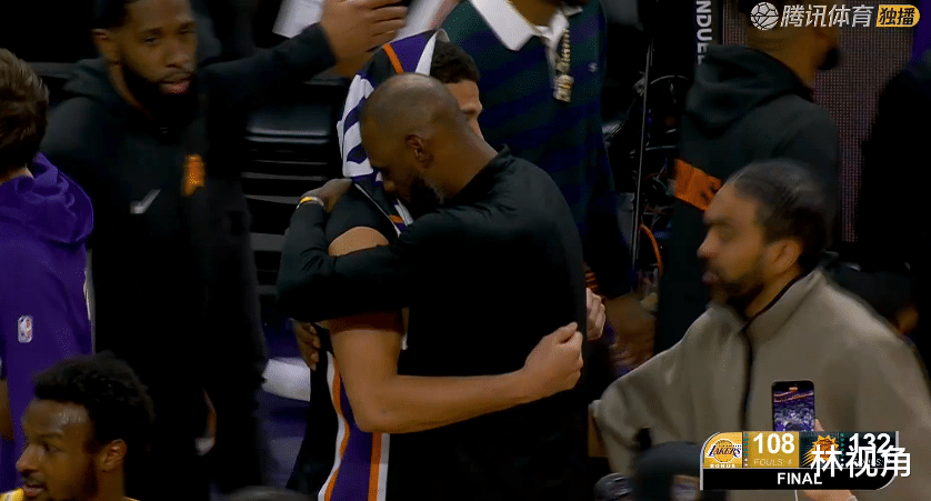 比赛结束,老詹并未退场,而是走向太阳替补席方向,一把抱住走过来的布克,两人亲切拥抱致意,虽然老詹和狄龙有恩怨,但和布克私交很好,两人在场边聊了起来,都显得很开心。
