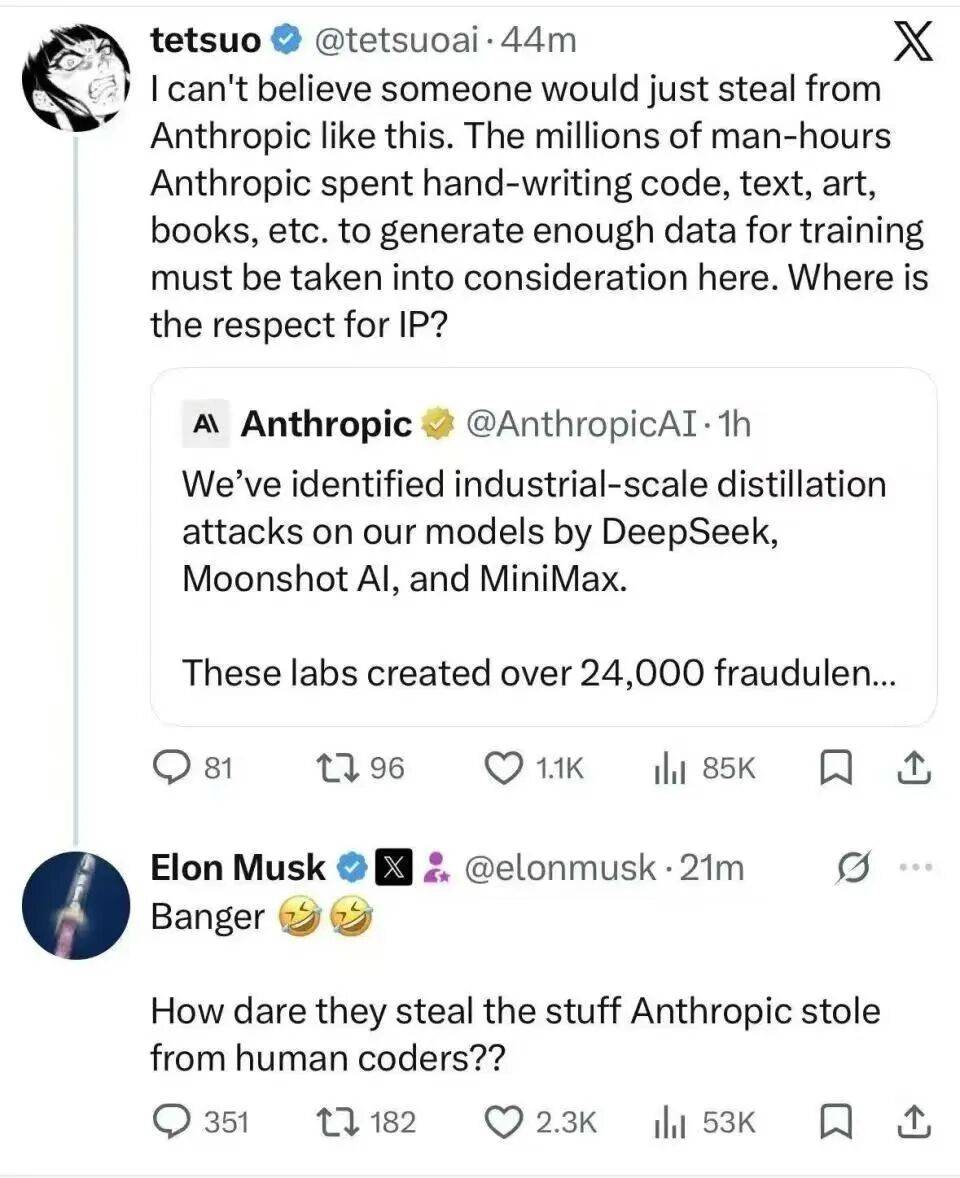 反正我看到马斯克吃瓜吃得很欢,不嫌事大的表示「他们怎么敢偷Anthropic从人类程序员那里偷来的东西?」