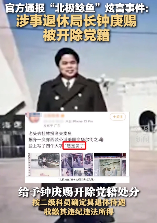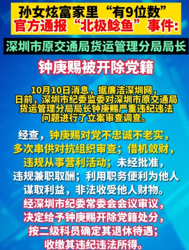 10月10日,北极鲶鱼事件最终结果被曝光,深圳纪委官方发出通报,声称北极鲶鱼口中的爷爷,是原来深圳交通局货运管理分局的局长钟某某,利用职务之便,非法获取他人财物,并且存在各种非法交易。而且对于这种严重违纪违法的行为,已经进行了立案审查调查。