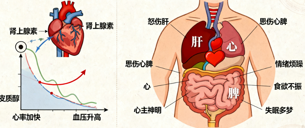 • 西医看应激:当人愤怒、焦虑或紧张时,身体会启动“应激反应”,大量释放肾上腺素、皮质醇等激素,导致心率加快、血压升高、心肌收缩力增强。长期处于这种状态,心脏会不堪重负,易诱发心律失常和高血压。