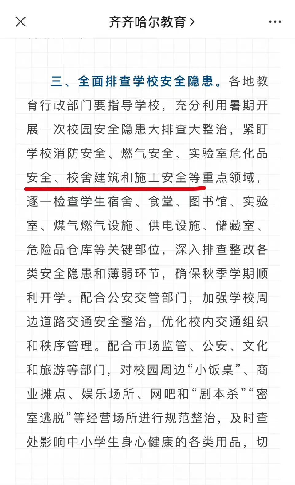 齐齐哈尔教育局距坍塌体育馆仅49米,齐齐哈尔教育局7月11日发布的《教育部发文,部署做好2023年中小学暑期安全工作》,还重点强调了校舍建筑和施工安全等重点领域……