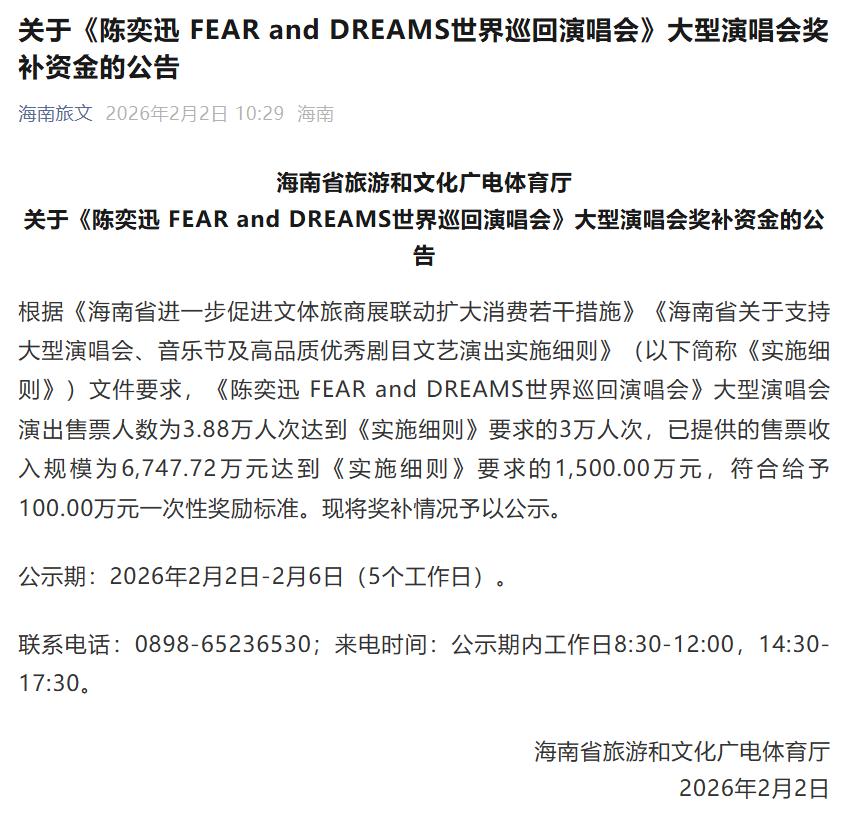 据公告,根据海南相关文件要求,《陈奕迅 FEAR and DREAMS世界巡回演唱会》大型演唱会演出售票人数为3.88万人次达到《实施细则》要求的3万人次,已提供的售票收入规模为6,747.72万元达到《实施细则》要求的1,500.00万元,符合给予100.00万元一次性奖励标准。现将奖补情况予以公示。