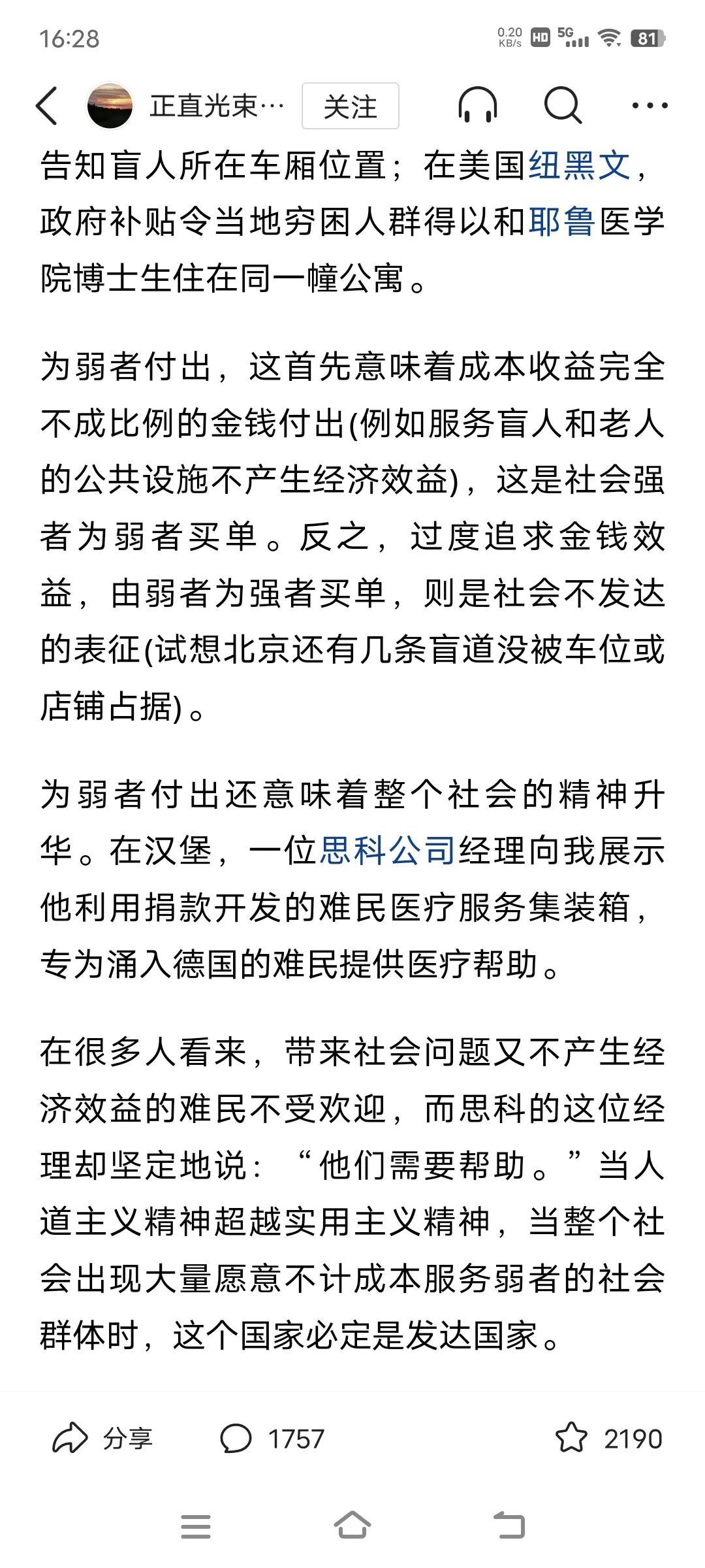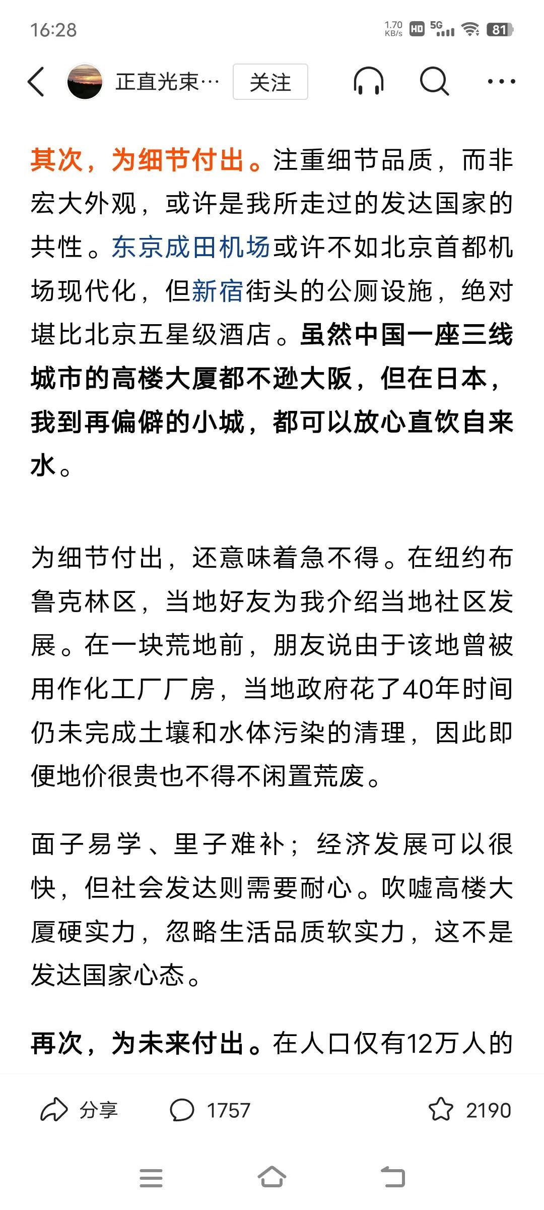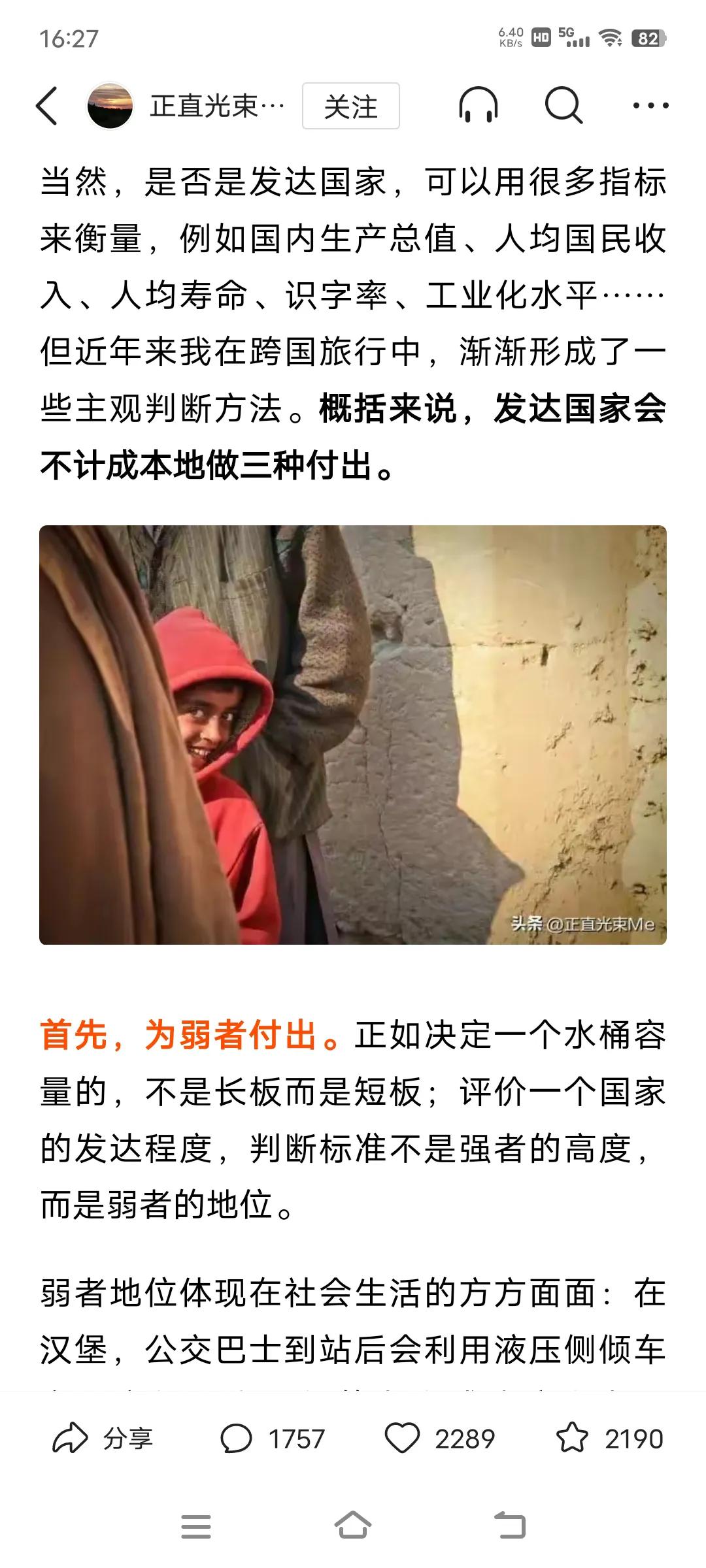 太搞笑了!外国破败的基建比不过中国了,又开始扯别的了,什么发达国家会不计成本地做三种付出。 第一种为弱者付出,什么在东京,所有地铁车门上都刻有盲文告知盲人所在车厢位置;在美国纽黑文,政府补贴令当地穷困人群得以和耶鲁医学院博士生住在同一幢公寓。 请问这位作者,中国扶贫是不是为弱者付出?中国所有偏远地区的基建是不是为弱者付出? 第二种为细节付出,什么新宿街头的公厕设施,绝对堪比北京五星级酒店。虽然中国一座三线城市的高楼大厦都不逊大阪,但在日本,我到再偏僻的小城,都可以放心直饮自来水。 吹什么不好,吹日本的水,中国偏僻小城的自来水不如日本的核废水马桶水好喝吗? 第三种为未来付出,竟然扯国外的环保节能,绿色电力和新能源汽车,太搞笑了,这几个方面,哪个国家敢说比中国做得好[允悲][允悲][允悲][马思纯的微笑][马思纯的微笑][马思纯的微笑]