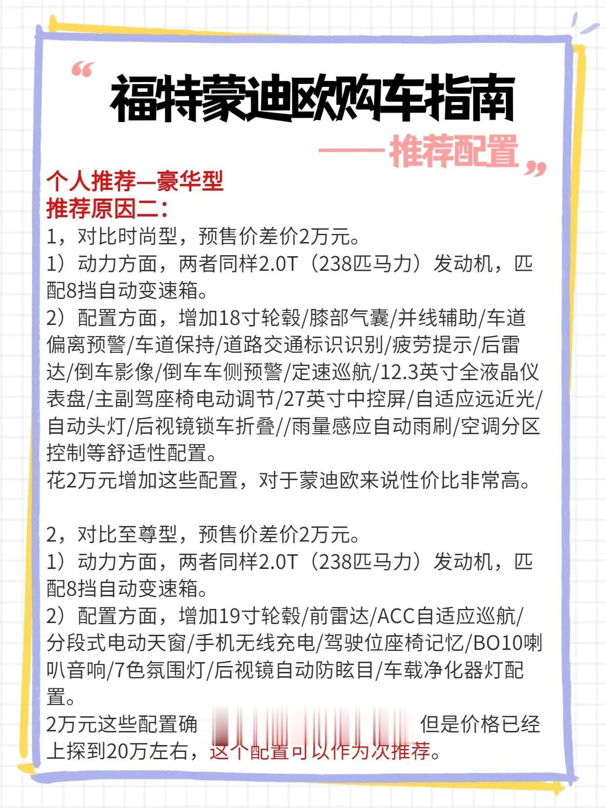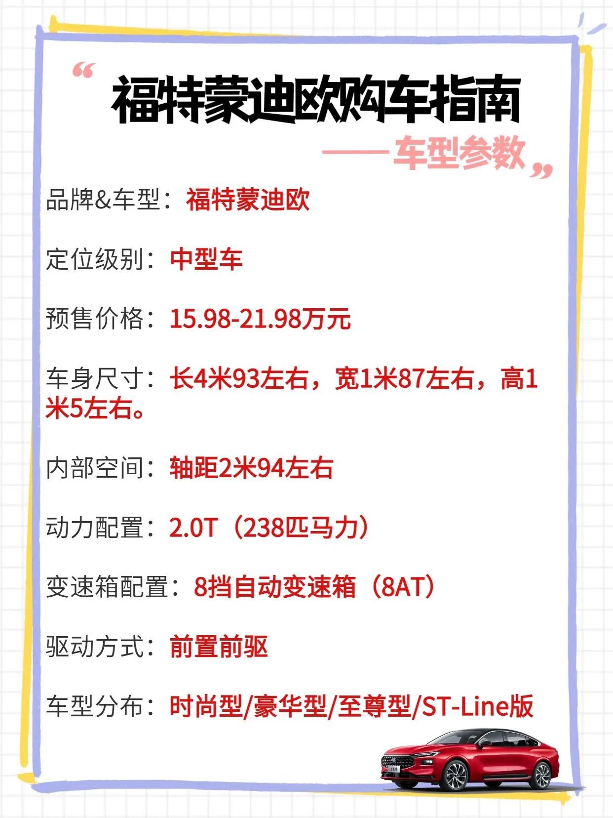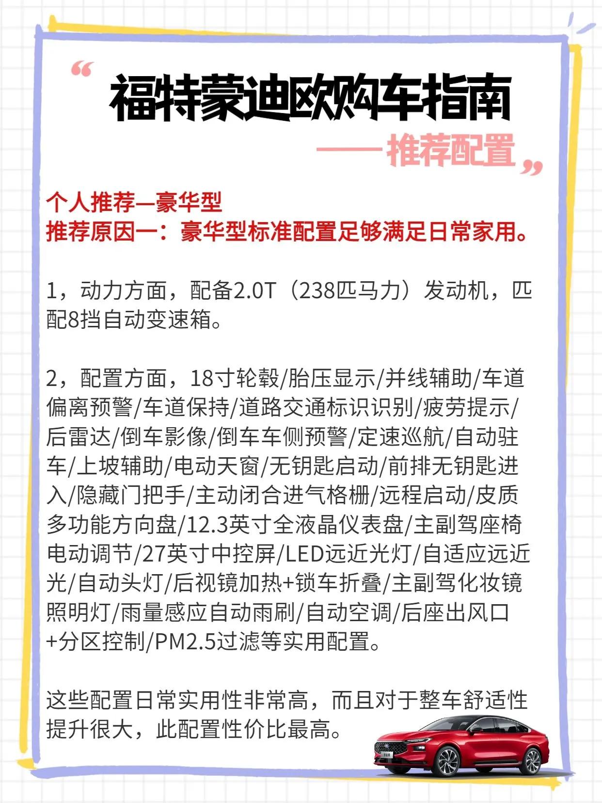 福特蒙迪欧购车攻略,选最划算的方式! 嗨,小蜜蜂们!福特蒙迪欧是一款一上市就备受瞩目的中型轿车,但经历多年未换代的痛苦之后,它似乎逐渐失去人们的热度。直到如今,福特终于推出了全新的蒙迪欧,铺满了2.0T发动机和8AT变速器。现在,全新的福特蒙迪欧预售起售价为15.98-21.98万元,它的款式已经趋于年轻化和运动化,并且还配备了27英寸中控大屏(低配除外),将人们的感觉再次振奋。今天我们就来看看购买福特蒙迪欧的指南,帮助你更选到最划算的那一款。 一、外观方面 全新的福特蒙迪欧已经改变了它标志性的武士头灯和“斯瓦拉”辐射进气格栅的设计,如今拥有了更年轻和时尚的姿态。标准的LED大灯和新式轮圈进一步强调了运动性和精致的车身设计。如果你想拥有更多的幻彩车漆和别致的黑色合金轮圈,高配款式应该会正好符合你的口味。当然,在外观方面,个人风格还是最为重要的衡量指标。 二、内饰方面 为了更好的符合大众的个性化需求,整个蒙迪欧内饰的形态和布局都是由工业设计师负责。新车的内部空间相当宽敞、时尚和功能齐全,配备有一系列高科技元素,而且中控台上的27英寸大屏- Sync+ 3系统,适应了一个更加直观和便利的操作。细节方面,家里需要额外的储物空间和自定义的功能能够得到有效缓解,并且座椅和手感也非常好,值得一提的是,在高配款式上,乘客会获得按摩功能和座椅加热皮肤满足更加舒适的体验。 三、动力方面 全新的福特蒙迪欧搭载了全铝发动机,该机器能够达到2.0T的输出功率,与八速自动变速器相匹配,可提供非常灵活和稳定的驾驶体验。在高速公路行驶时,车辆变速器的响应速度非常快,即使在弯路驾驶时,依旧很平稳。整体来说,这款车给人的感觉是非常乐观和容易意识到的。 四、总结 总的来说,全新的福特蒙迪欧拥有不同的按键和功能以适应个人需求,极佳的品质也或许会吸引您的眼球。不仅如此,适应现代空调和音响、无线充电、周视图后摄像头等等都是值得发布的前沿设计。如果你正在考虑购买福特蒙迪欧,那么以上的这些购车指南或许会帮助到你选到最划算的那一款。