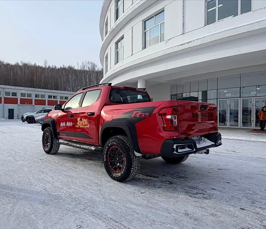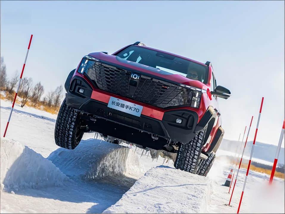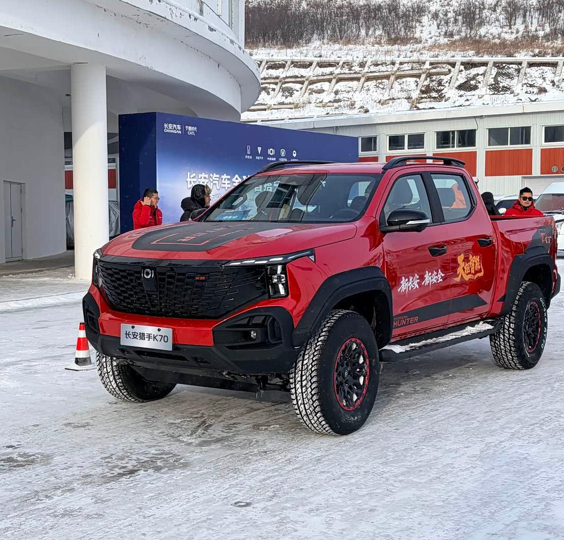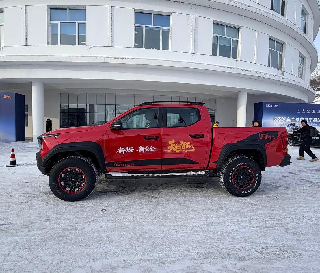 新车在2月5日首发亮相,该车只是原型车,其量产版本将于年中正式推出。新车定位高于现款猎手K50,主要面向需要兼顾城市通勤与复杂路况的消费群体。新车外观总体延续家族风格,前脸搭配无边界中网,熏黑网格格栅向两侧延伸闭关收敛,与两侧的“T”字形大灯组融合,前保险杠熏黑,两侧与侧导风槽形成整体,视觉冲击力强烈;后视镜、踏板、轮眉、车顶行李架熏黑,机盖与侧裙加入黑色配色,车身侧面采用双排座布局,侧裙处配备专属拉花,离地间隙达240mm,通过性显著提升;尾部货箱支持分段式开启,虽未配备龙门架,但后包围集成拖车方口与脚踏,拥有强烈越野属性。