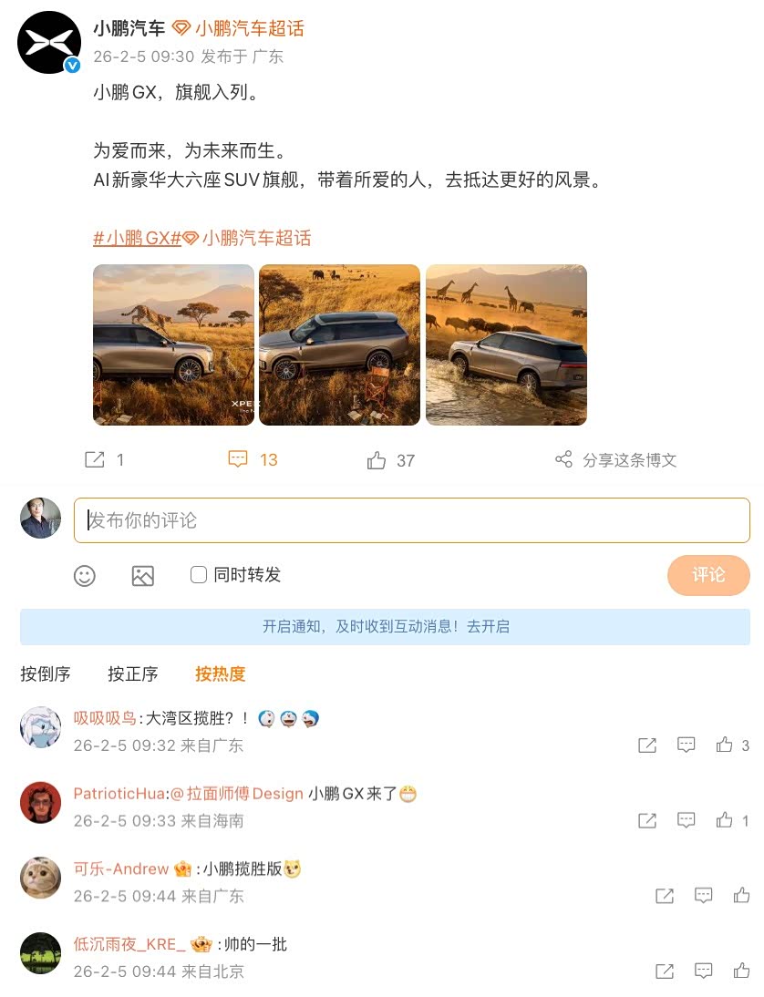 小鹏汽车在2月5日发布了新车官图,该车是此前曝光的代号为G01的车型。新车外观采用全新设计语言,与小鹏在售车型风格均不相同。新车前脸封闭平直,半环形贯穿行车灯分成三段,并采用宽幅设计,大灯组与侧导风槽融合,前脸更具商务气息;侧面轮廓与路虎揽胜风格相似,车型悬浮设计,前翼子板处加入竖向旗标后视摄像头饰板,倾斜D柱与后悬底部上收设计营造豪华感,密辐式轮毂与侧裙镀铬饰条提升精致度。车尾整体风格与全新P7有异曲同工之处,宽幅直角贯穿尾灯与层次感尾部构造,中间嵌入两道立体竖线,整体造型沉稳且具辨识度,被网友称为大湾区揽胜。