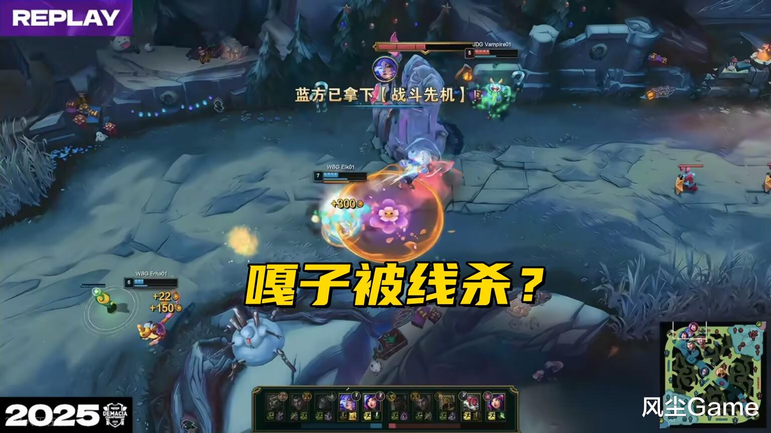 决胜局是盲选模式,两队打野都选了杰斯,双人组也是相同的芸阿娜+妮蔻组合,这把京东下路出问题了,前期换血一直是劣势,ELK全程压着Gala打,9分钟换线到上路,嘎子直接被线杀,如果是辅助有差距的话,被线杀还能理解,但Vampire的妮蔻,对位是完爆二哈的,这就有点抽象了。