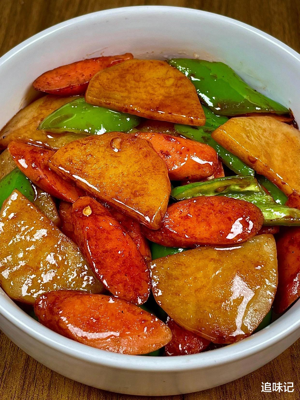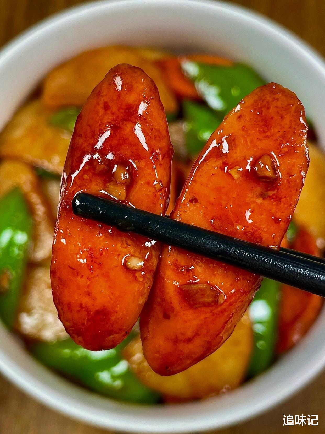 土豆片焯水后保持了脆嫩的口感,火腿肠煎得金黄焦香。青椒的清新辣味融入其中,再加上生抽和蚝油的调味,简单却让人回味无穷。