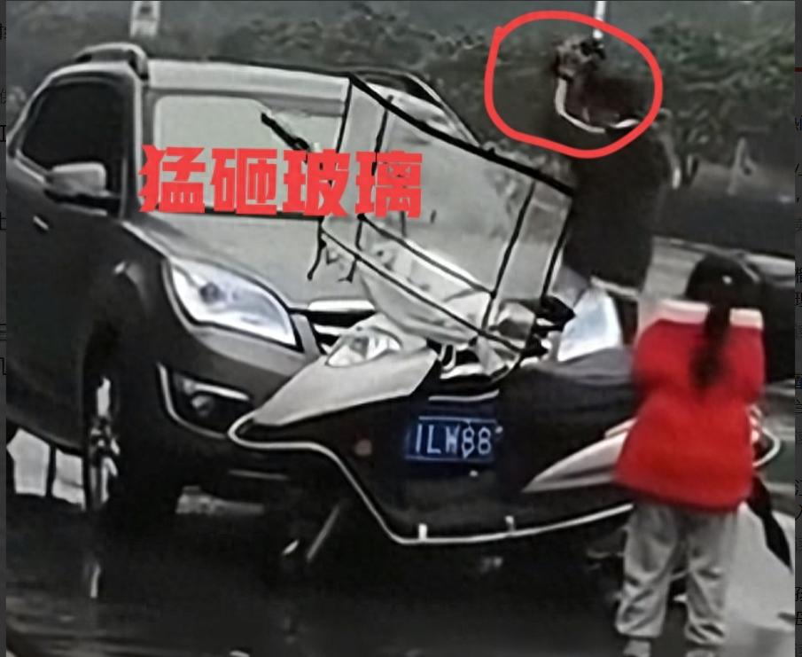 “哐当” 一声巨响,玻璃瞬间裂开蛛网般的纹路。可男子依旧怒气冲冲,一边嘴里骂骂咧咧,一边抡起石头反复猛砸,不过几下功夫,挡风玻璃就被砸出一个大洞。他似乎还不解气,扔掉石头就要往汽车引擎盖上爬,看样子是想冲进驾驶室找车主理论。
