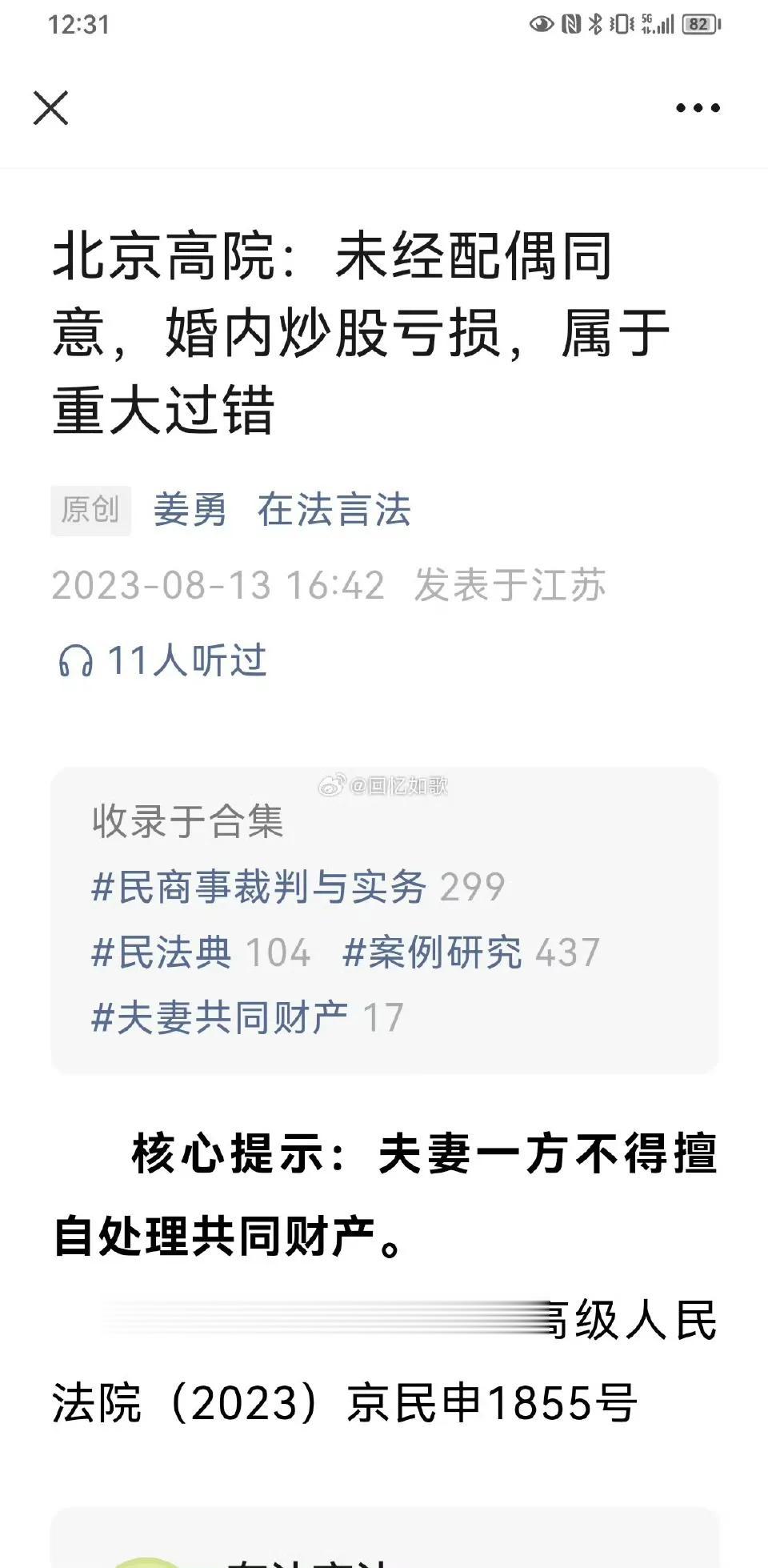 杨瑾 15 2023-08-14 19:41 先把财产平均分好。然后男方只用自己那份炒股,盈亏自负。 稀饭配酸菜 回复 08-15 09:01 我家各管各的钱,大事一起凑,小事谁方便谁给。完全没有这些问题。 用户10xxx98 回复 08-14 21:57 如果赚钱了,算不算婚后共同财产?
