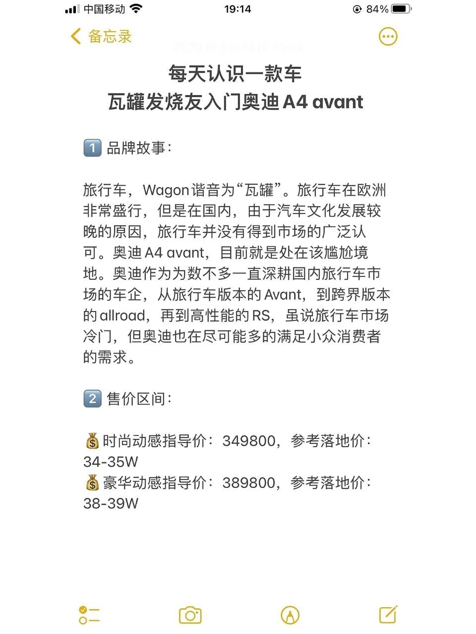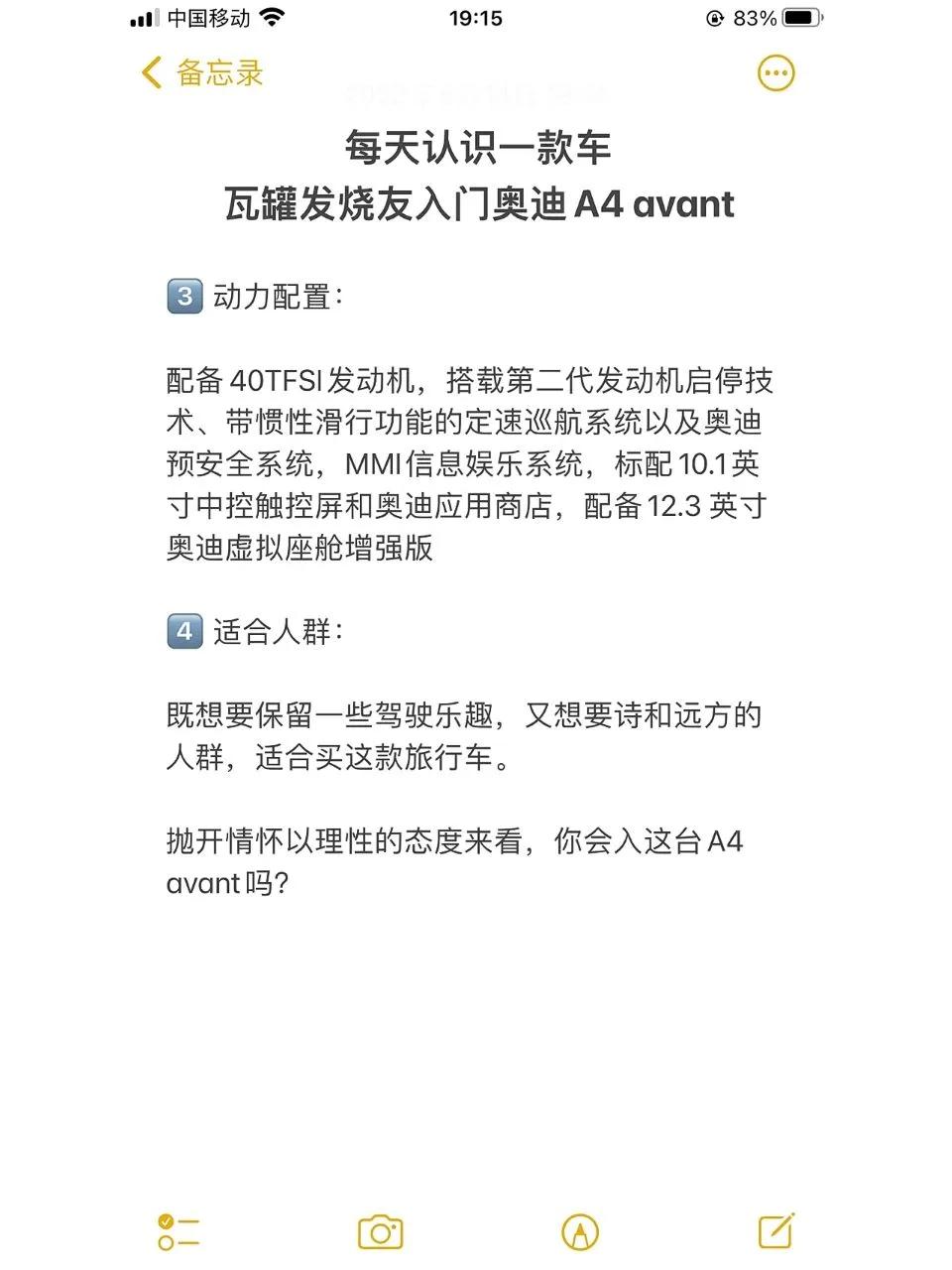奥迪A4 Avant到底值不值得购买? 随着旅行车在国内的市场逐渐升温,奥迪A4 Avant作为旅行车市场的重要代表之一,备受消费者关注。那么,购买这款旅行车到底值不值得呢? 从动力配置方面来看,奥迪A4 Avant配备了强劲的40 TFSI发动机,搭载第二代发动机启停技术和惯性滑行功能的定速巡航系统,以及奥迪预安全系统,这些配置都让人非常满意。 在信息娱乐系统方面,A4 Avant标配10.1英寸中控触控屏和奥迪应用商店,并且配备12.3英寸的奥迪虚拟座舱增强版,让驾驶者在长途旅行中可以享受更加丰富的娱乐和舒适性。 奥迪作为一家一直深耕旅行车市场的厂商,A4 Avant不仅有着旅行车版本的Avant,还有跨界版本的allroad和高性能的RS,让更多消费者能够根据自己的需求进行选择。同时,A4 Avant的时尚外观和宽敞的空间也是其吸引消费者的重要原因。 但是,价格也是消费者购买A4 Avant时需要考虑的因素。虽然参考落地价在34-39万之间,但相较于一些同级别的品牌,价格也算是比较亲民的了。此外,虽说旅行车市场正逐渐升温,但相比轿车和SUV等车型,旅行车市场仍属于小众市场,对于追求高性价比的消费者来说,A4 Avant可能并不是最优的选择。 综上所述,虽然价格略高,但奥迪A4 Avant在动力、信息娱乐系统以及外观和空间方面都有着不俗的表现,对于那些既想要保留驾驶乐趣又追求诗和远方的消费者来说绝对值得购买。