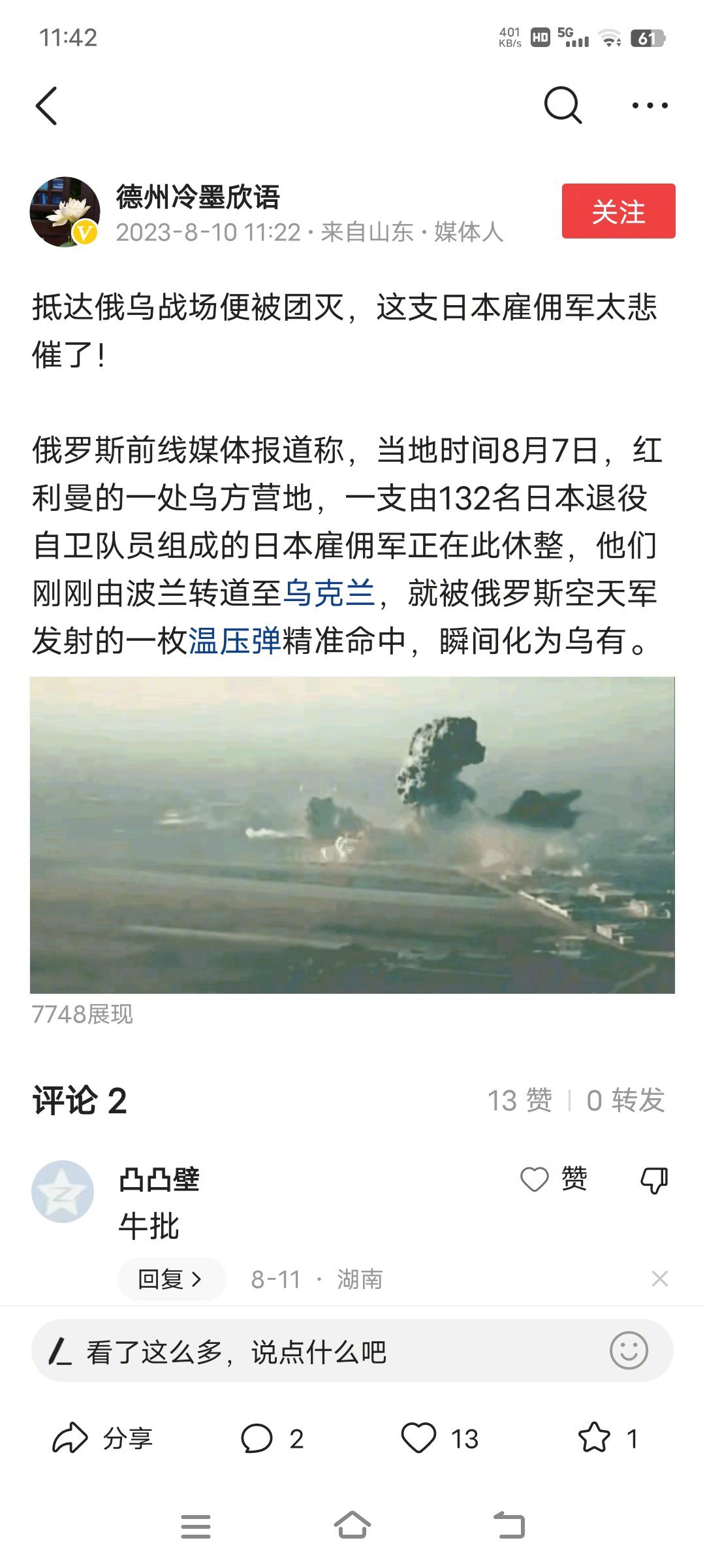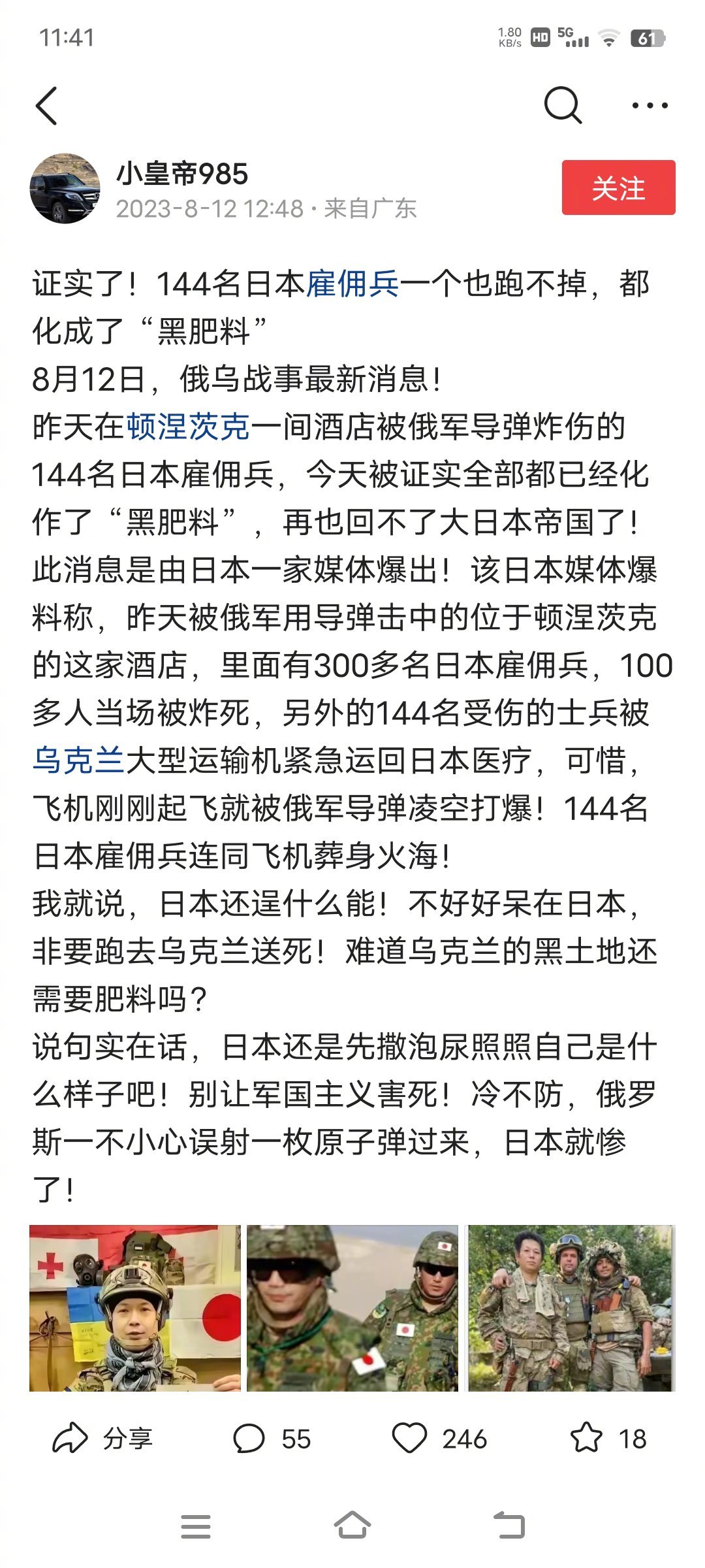 请叫我华仔 5 2023-08-17 07:37 什么雇佣兵,还不如说志愿军[滑稽笑] 用户30xxx68 回复 08-17 10:45 你什么成分,别侮辱志愿军这个词 请叫我华仔 回复 用户30xxx68 08-17 12:00 志愿军只有中国有吗,多看书多学习。