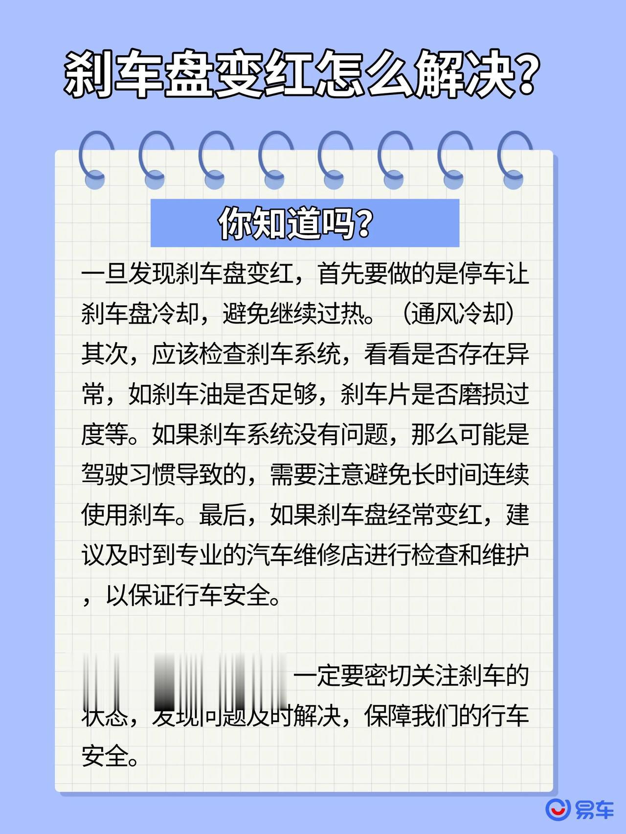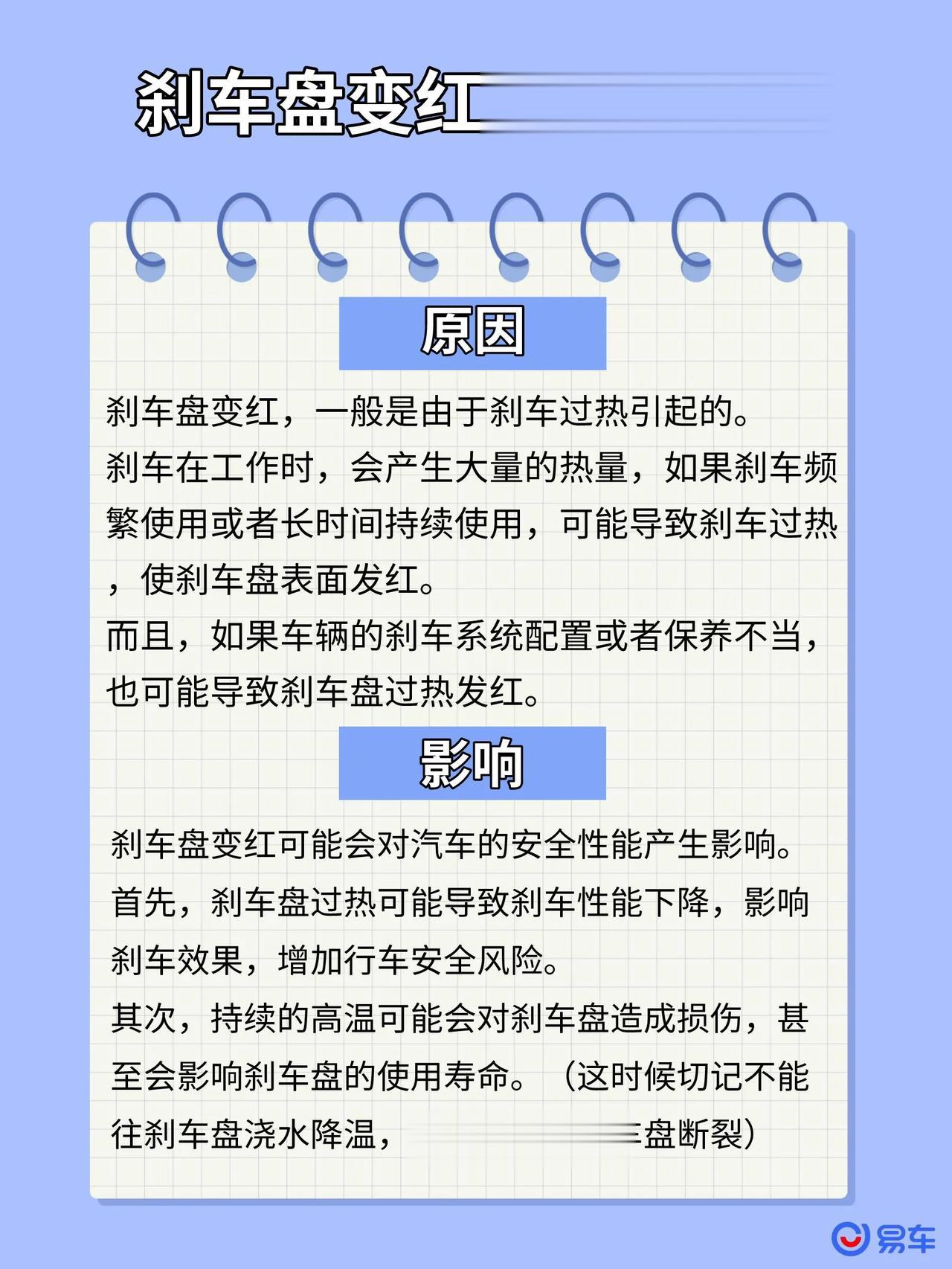 【实用技巧】遇到刹车盘变红怎么办? 在我们日常的行车过程中,经常有一种状况是刹车盘变红,这个问题看似不大,实际上可能会对我们的行车安全产生影响。那为什么会变红呢?该如何解决呢? 为什么会变红? 当我们踩下刹车时,刹车片与刹车盘产生摩擦,摩擦强度越大,热量就越多,时间越长,会导致刹车盘表面过热变红,这是一种比较常见的情况。此外,刹车盘发红也有可能是车辆刹车系统配置或者保养出现问题。 变红的影响 刹车盘变红可能会对我们的行车安全产生影响,需要我们及时处理。过热会导致刹车性能下降,刹车效果不佳,增加行车安全风险。此外,长时间受高温影响,刹车盘也会遭到损坏,甚至会影响刹车盘的使用寿命。一旦发现刹车盘变红,不应急躁,更不能马上往刹车盘上浇水,需要慢慢放凉。 如何应对? 一旦发现刹车盘变红,应该首先缓慢停车,并停车等一段时间让刹车盘自然冷却(大约10-15分钟),切莫让其继续过热或冷却过快。接着,检查一下刹车系统,看看刹车油、刹车片磨损等是否正常。如没有问题,则需要注意自己的驾驶习惯,避免长时间连续使用刹车。最后,如果刹车盘经常变红,建议及时到专业的汽车维修店进行检查和维护,以保证行车安全。 总的来说,刹车盘变红可能不是一个很危险的故障,但它也不应被轻视。我们在行车过程中,需要时刻关注刹车的状态,并进行及时的处理,以保障行车安全。