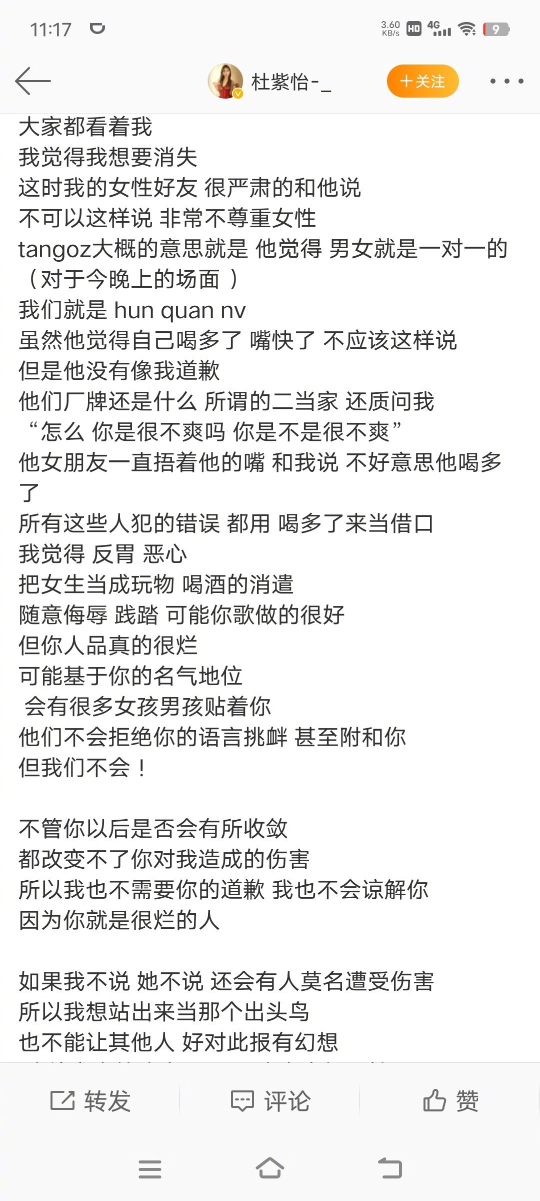 #TangoZ再发文回应#酒吧没有监控,这件事情就很难说了,女的说男的说抠脚了,