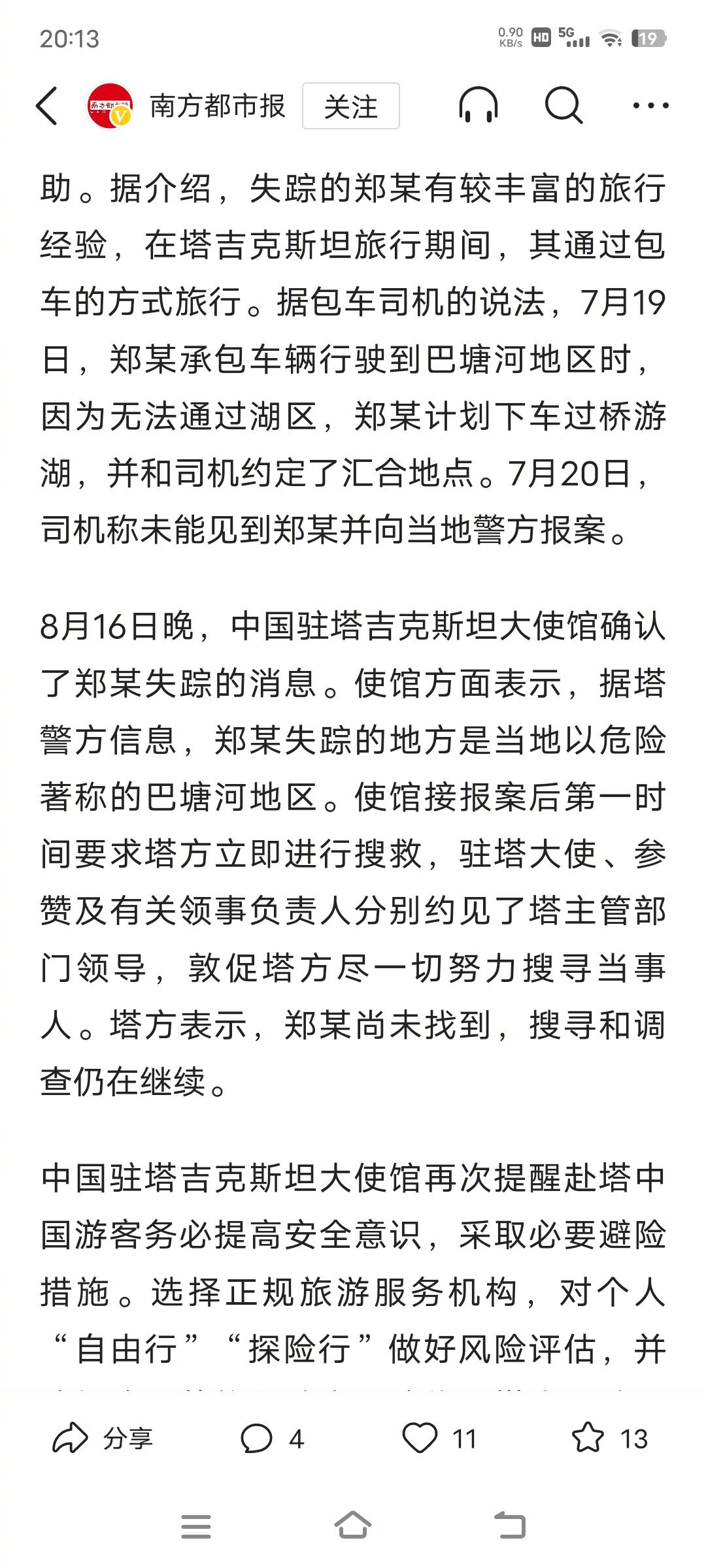 8月16日晚,中国驻塔吉克斯坦大使馆确认了郑某失踪的消息。使馆方面表示,据塔警方信息,郑某失踪的地方是当地以危险著称的巴塘河地区。
