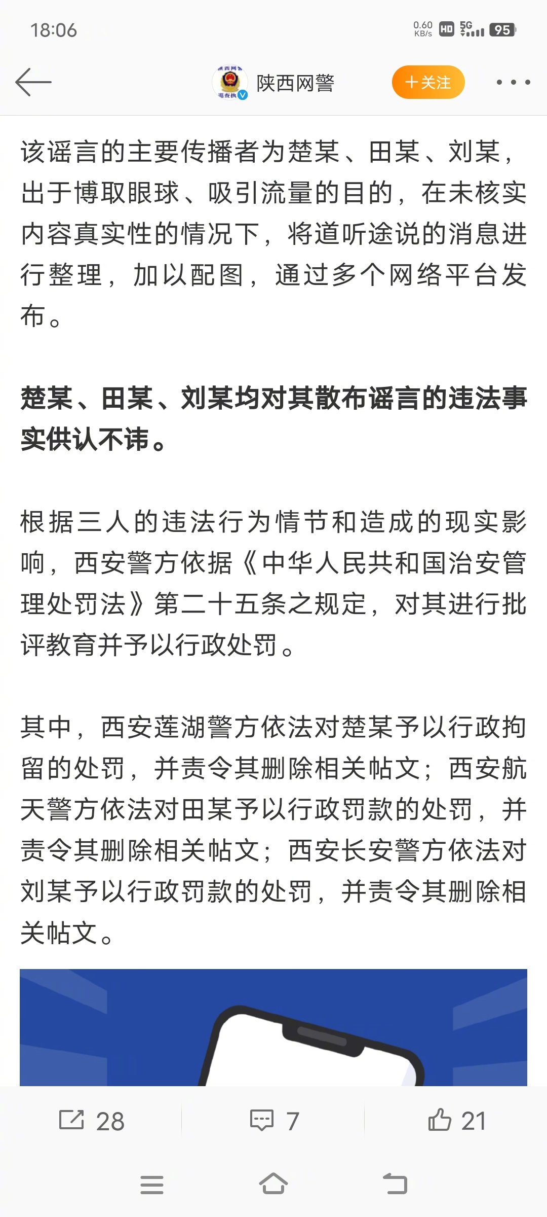 西安莲湖警方依法对楚某予以行政拘留的处罚,并责令其删除相关帖文;西安航天警方依法对田某予以行政罚款的处罚,并责令其删除相关帖文;西安长安警方依法对刘某予以行政罚款的处罚,并责令其删除相关帖文。