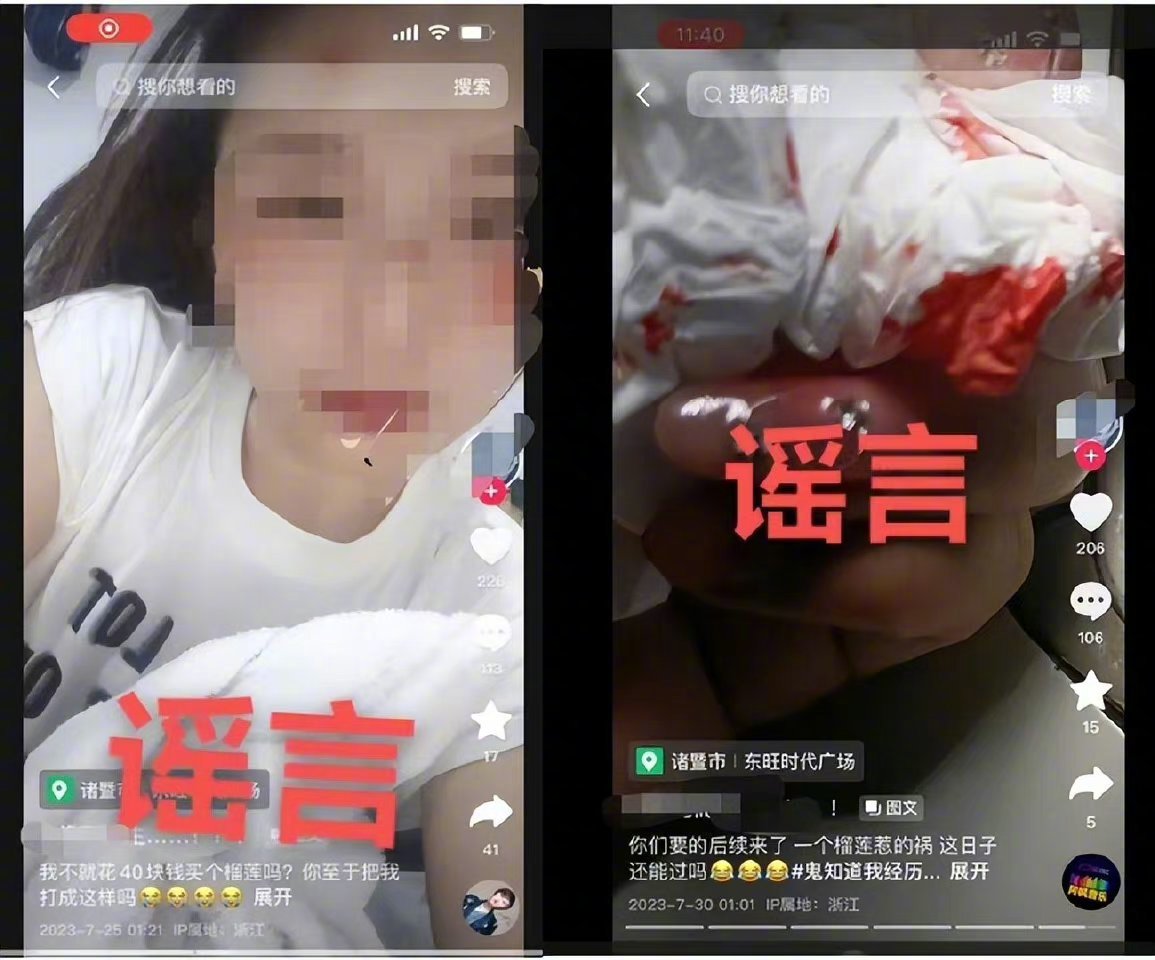 公安机关迅速开展相关工作,第一时间对视频发布者进行调查。经查,视频发布者郑某某,对编造网络谣言的行为供认不讳,其为了博取关注与流量,故意将其前段时间受伤的照片结合榴莲照片,编造了因买榴莲被家暴的谣言,刻意博人眼球 。经民警批评教育,郑某某深刻认识到自己的错误并删除相关视频。依据《中华人民共和国治安管理处罚法》,郑某某已被绍兴警方处以行政处罚。