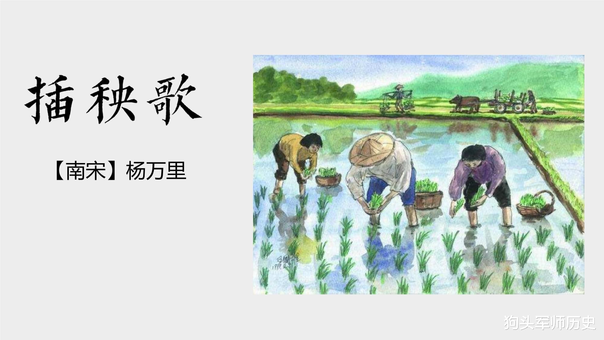 主题和意义:《插秧歌》是南宋诗人、文学家杨万里创作的一首七言古诗。这首诗生动地描绘了江南农户全家总动员插秧的情景。前四句通过纯粹的描写手法,展现了插秧的繁忙场面,充满了表现力。后四句则以特写般的方式,描绘了唤醒农人、低头劳作的情景,生动地表现了农家插秧的真实情境。整首诗以生动活泼的描写令人耳目一新,唤起人们对农耕时节的回忆。