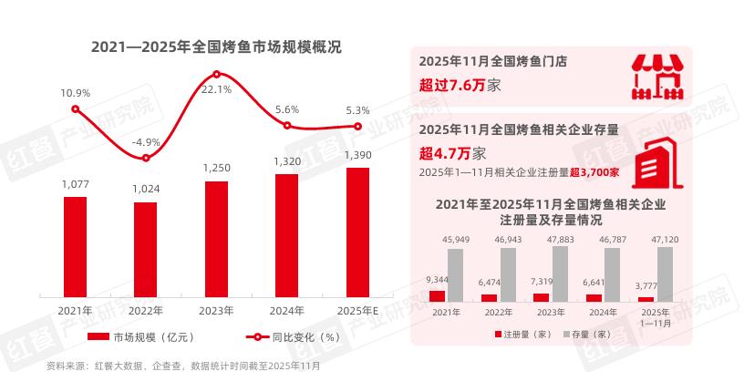 随着一批区域烤鱼品牌王者的相继跑出,烤鱼品类整体市场保持稳中有增的趋势。红餐大数据显示,截至2025年11月,全国烤鱼门店超过7.6万家,市场规模已超2024年的1320亿元,达1390亿元,预计2025年整年将接近1400亿元。